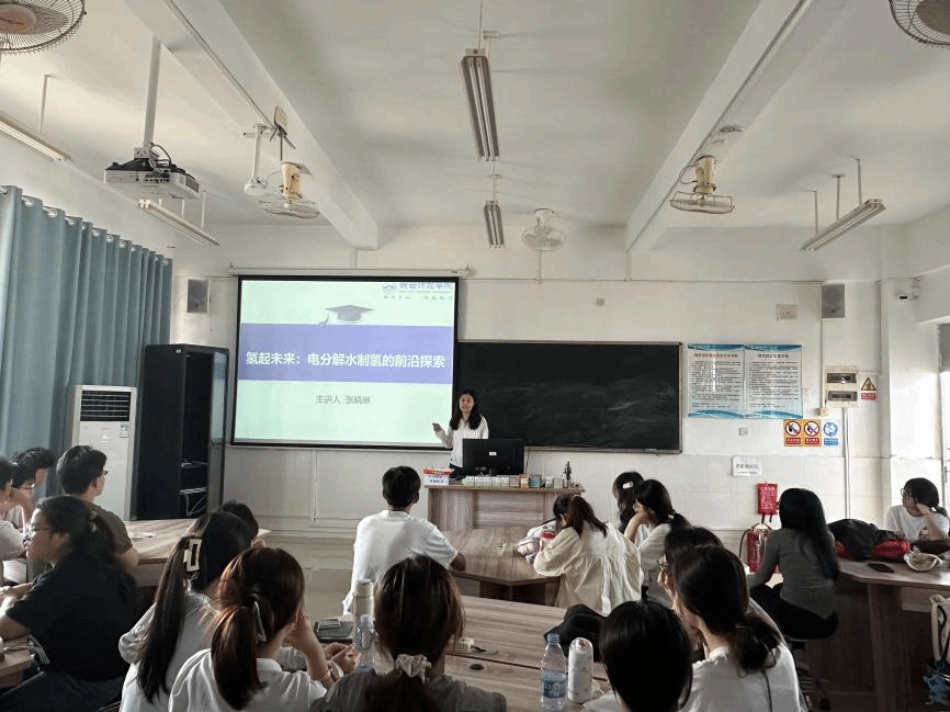 讲座开场,张老师以当下全球能源转型的紧迫形势为切入点,生动阐述了传统能源面临的困境,提出了清洁高效的氢能在未来能源格局中的重要地位。从生活中常见的氢燃料电池汽车,到工业领域对氢气的潜在需求,张老师通过丰富的实例,迅速点燃了同学们对氢能源的探索热情。