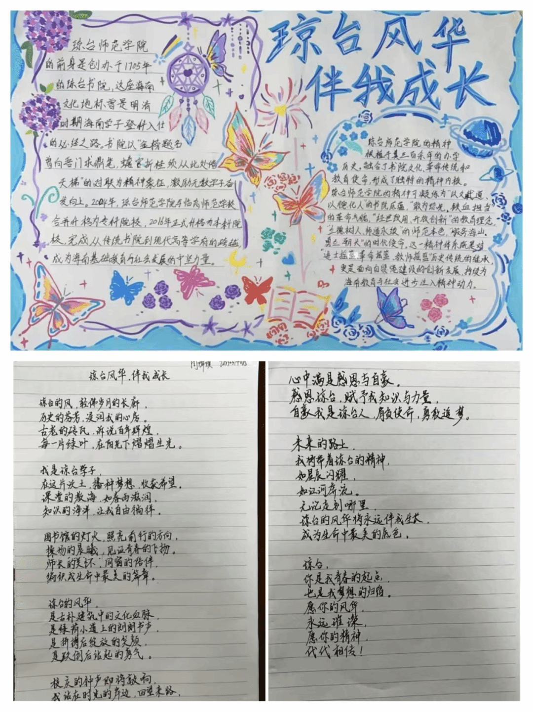 绘画作品色彩斑斓,或细腻描绘校园一角,或大胆展现心中的琼台印象;海报设计创意十足,融合校史文化与现代元素,传递着琼台精神。作文里,同学们用文字抒发对学校的热爱、成长的感悟,字里行间满是深情。