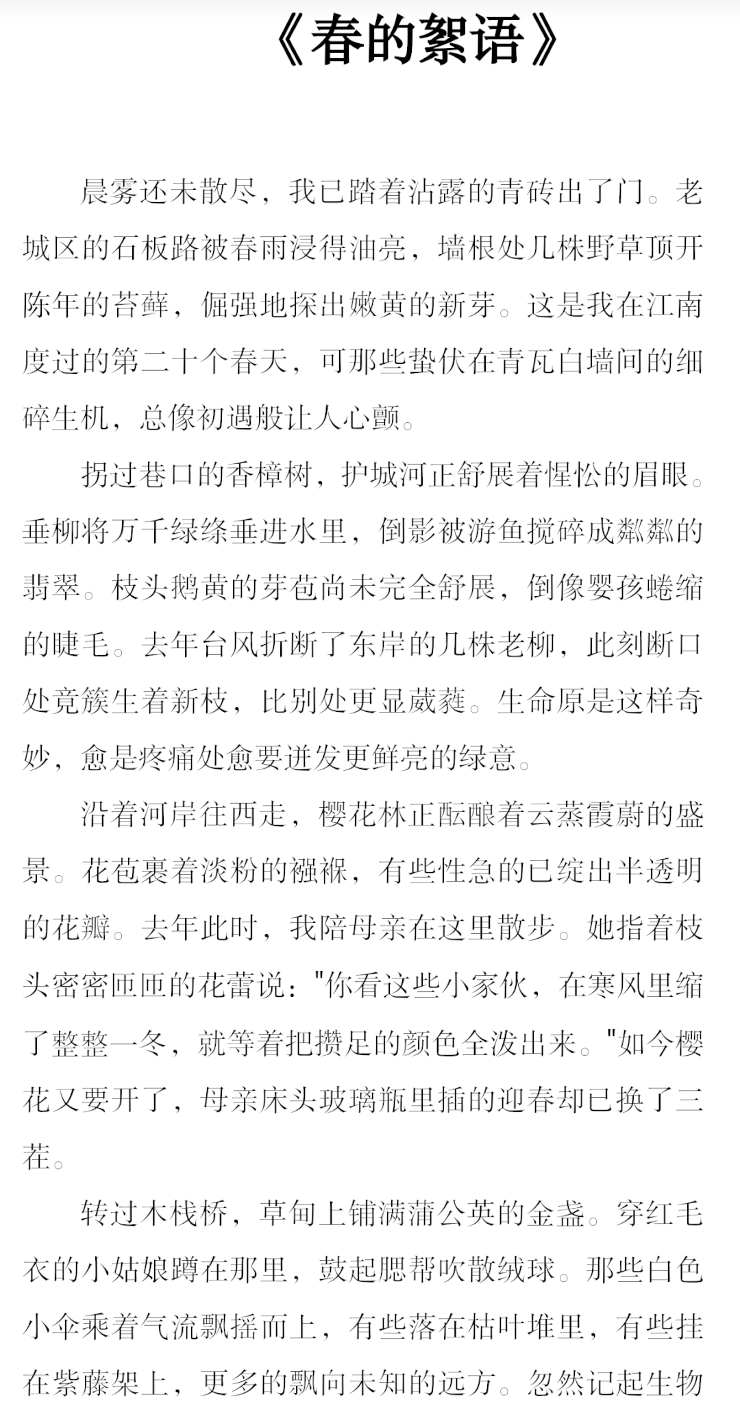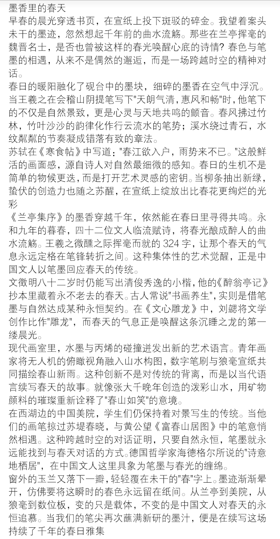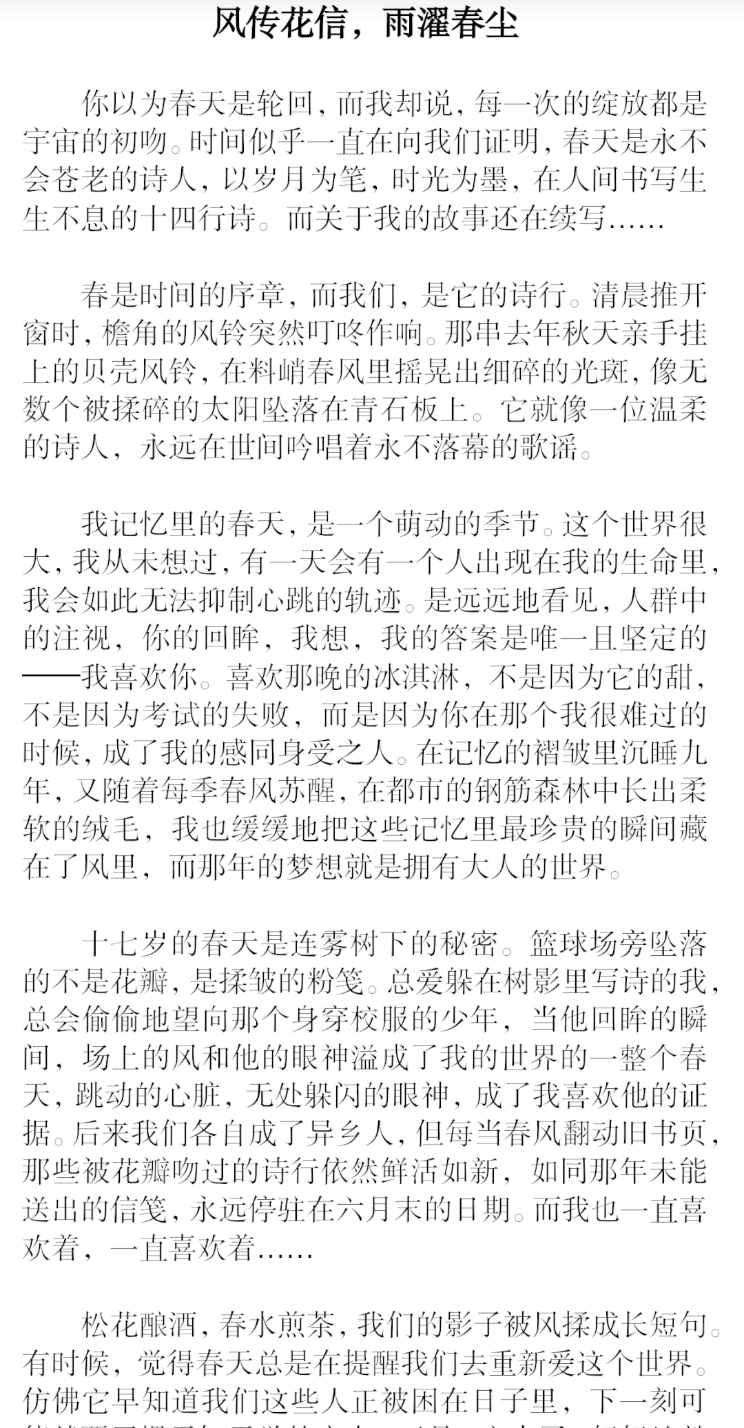 以“春光明媚,笔墨生花”为主题的征文活动,通过文字记录春天的美好,激发创作灵感,弘扬文学艺术。同学们被鼓励从自然与生活中汲取灵感,传递希望与正能量,这不仅有助于提升自身的写作能力与审美素养,同时也能促进社会互动与文化传播。活动为文学爱好者提供了展示才华的平台,让同学们可以记录生活美好、留存时代记忆,并且有助于培养环保意识与自然情怀,为文学创作与文化发展注入活力。