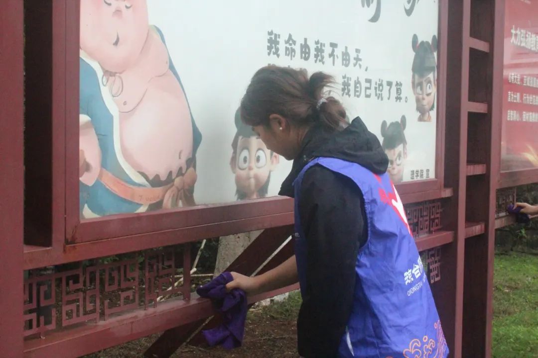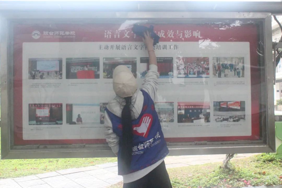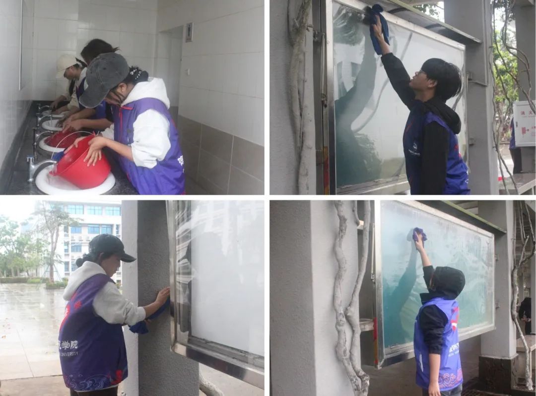 志愿者们在校园里形成一道亮丽的风景线。志愿者专注地擦拭宣传栏,他们站在合适位置,仔细地用抹布抹去玻璃和边框上的灰尘。整个场景回荡着水桶里抹布的漂洗声、抹布与玻璃的摩擦声,交织成一曲劳动的赞歌。