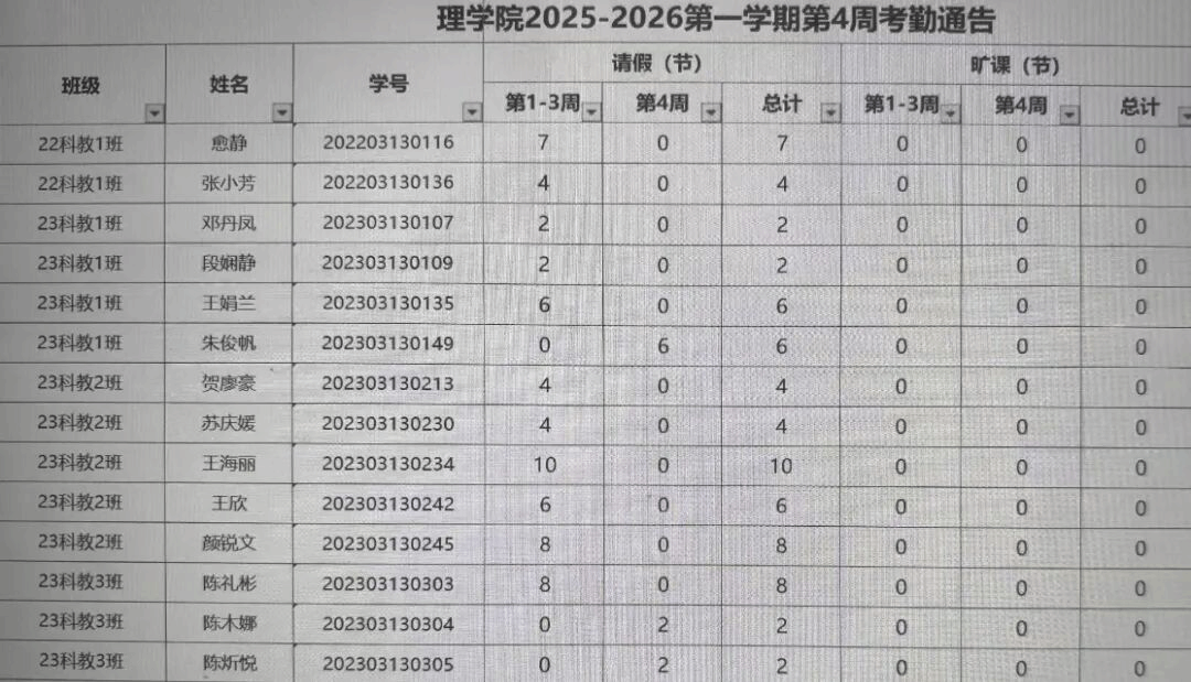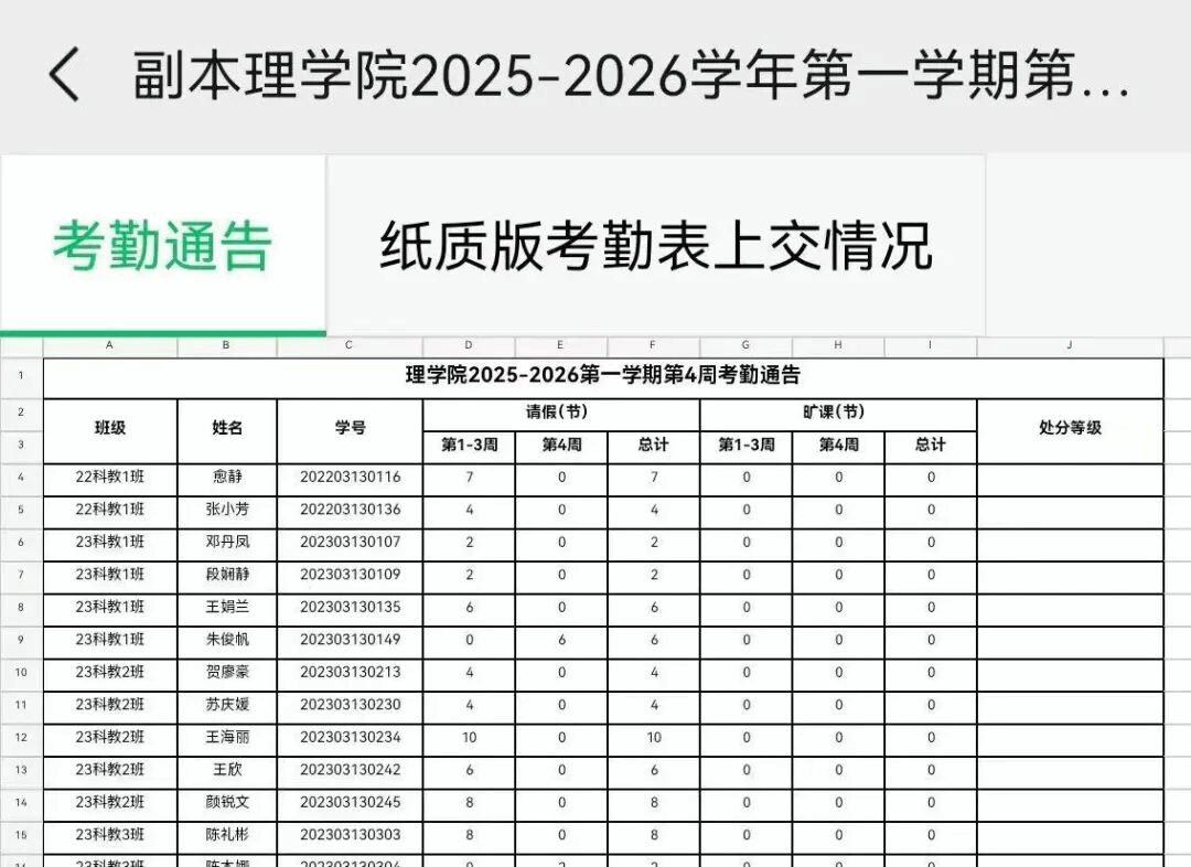 理学院团委学生会综合管理部将每周一次汇总电子版考勤表,并在班级考勤群中公示一周的考勤成果。