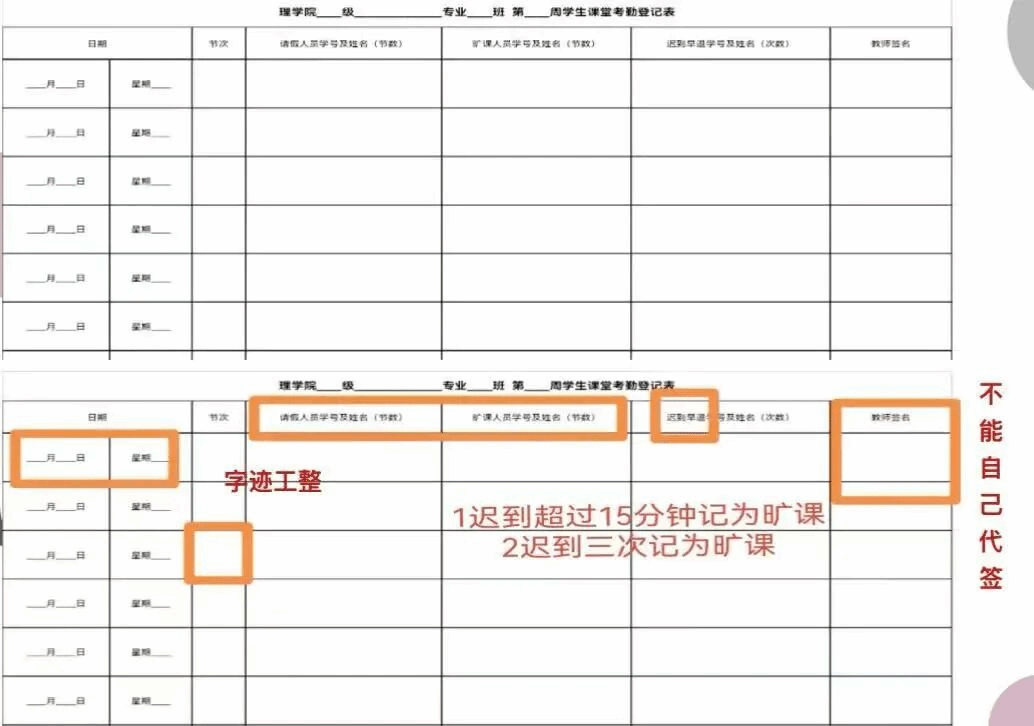 会议中强调了考勤表书写的规范,要求字迹工整,教师签名处不可由学生代签,迟到超过15分钟记为旷课,迟到三次记为旷课。