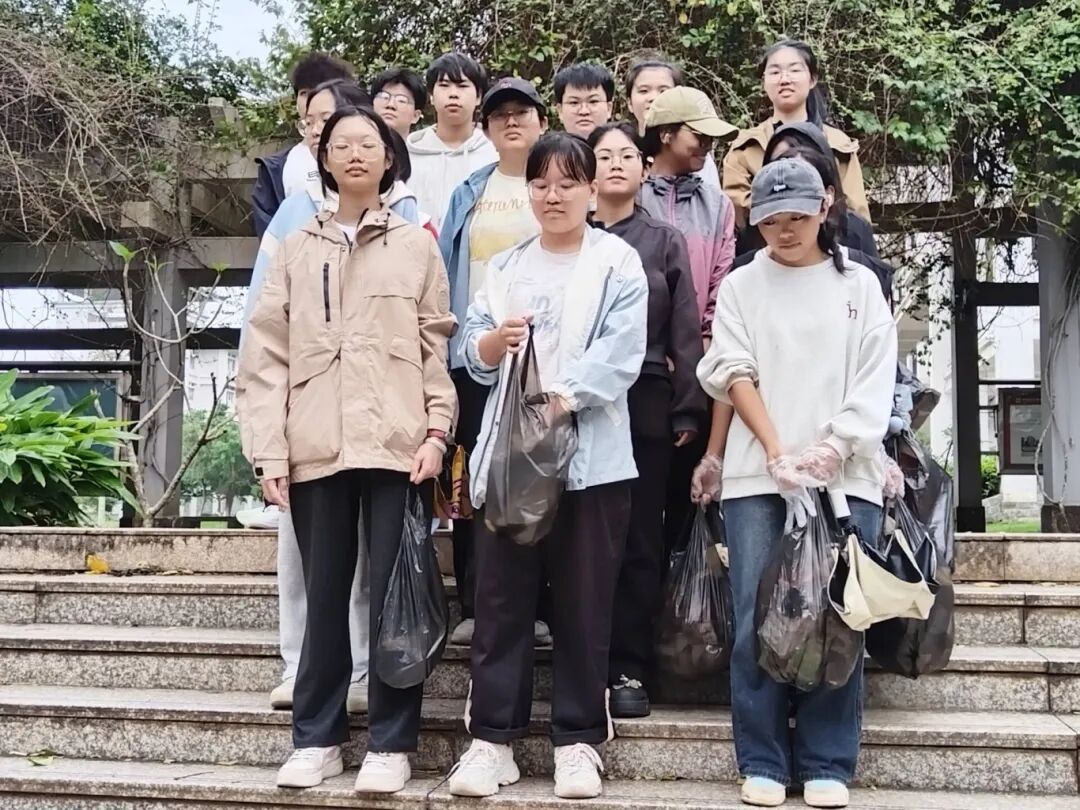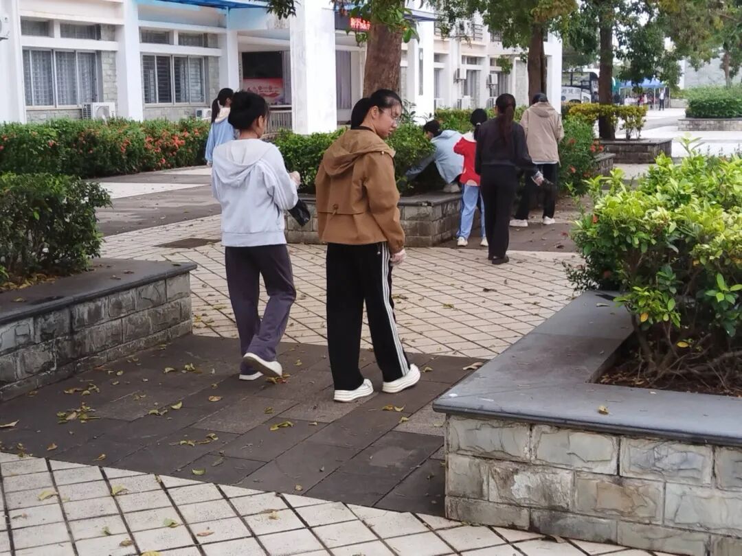 同学们手持扫帚、簸箕和垃圾袋,分组清扫路面落叶,清理花坛隐藏的杂物,最后统一处理垃圾,用辛勤的劳动换来校园的清新整洁。