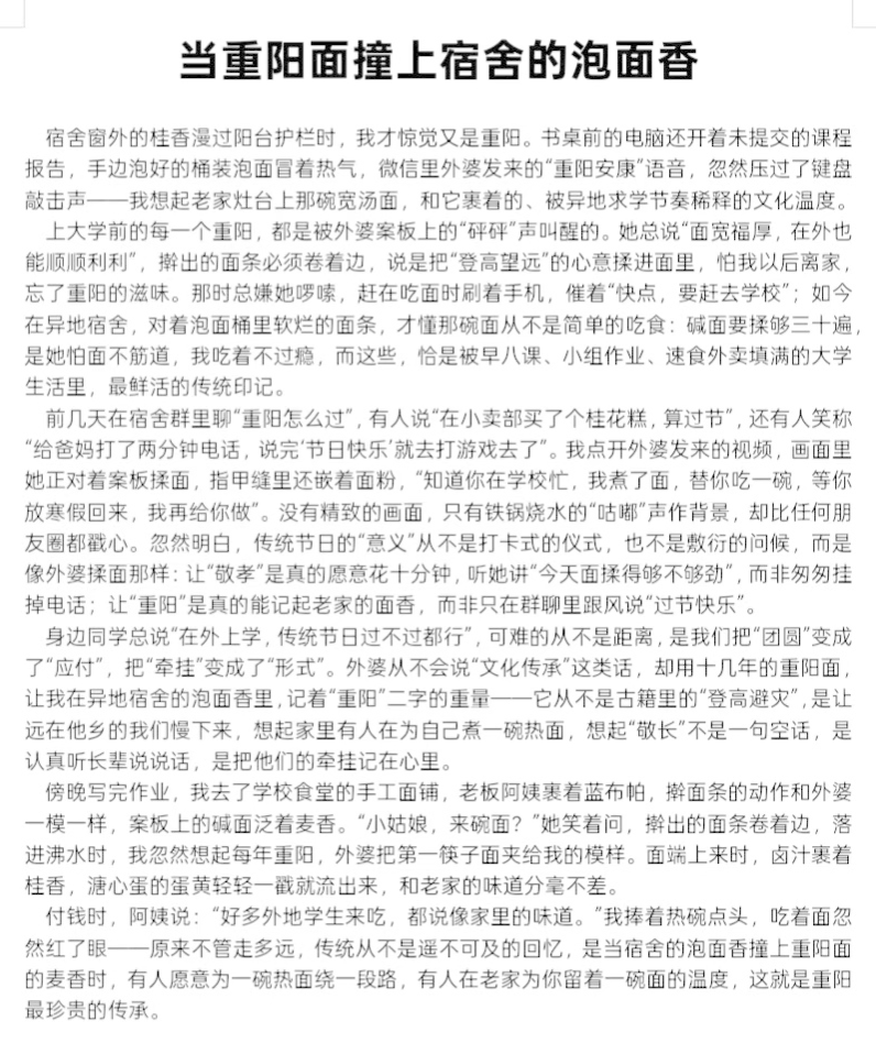 作品类型涵盖记叙文、散文、书信等。同学们用细腻的笔触,书写对长辈的感恩与牵挂。每一篇征文都饱含温情,既有对重阳习俗的生动描摹,也有对祖孙日常的真切回忆,更有对“孝亲敬老”的深刻感悟。这些文字充分展现了理学院的同学不仅拥有严谨的逻辑思维,更怀揣着温暖真挚的家国情怀,实现了理性与感性的完美融合。
