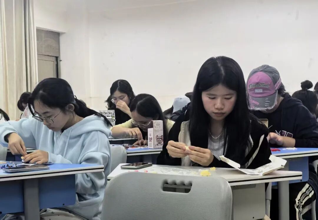 在活动过程中,同学们皆敛声静气,指尖在细碎的积木零件间轻转,目光紧随手中的拼接进度,将注意力全然倾注于作品的成型过程里。从零件归位到结构渐显,手工创作的乐趣随着作品的轮廓愈发清晰,专注的氛围里,每一次拼接的轻响都带着沉浸式的愉悦,让这场动手实践成为了舒展思绪、收获成就感的契机。