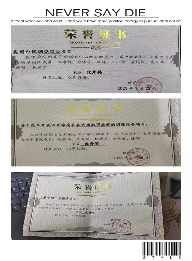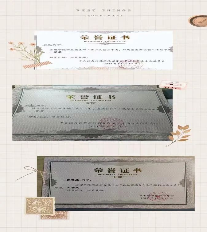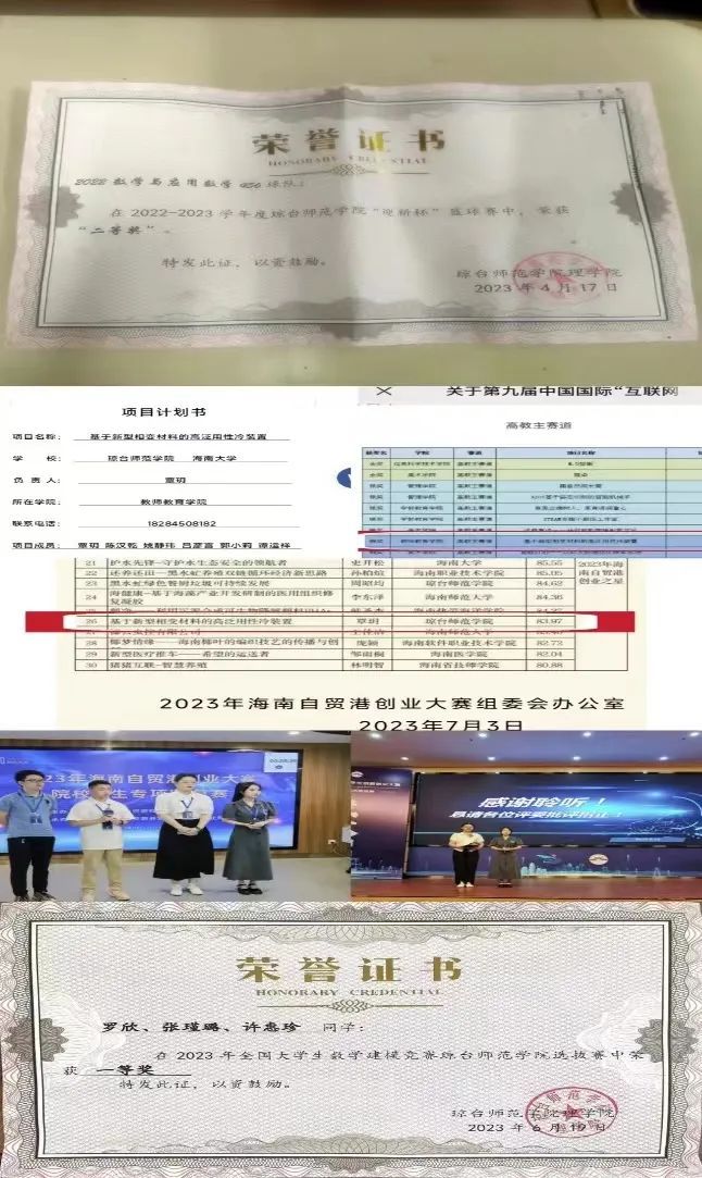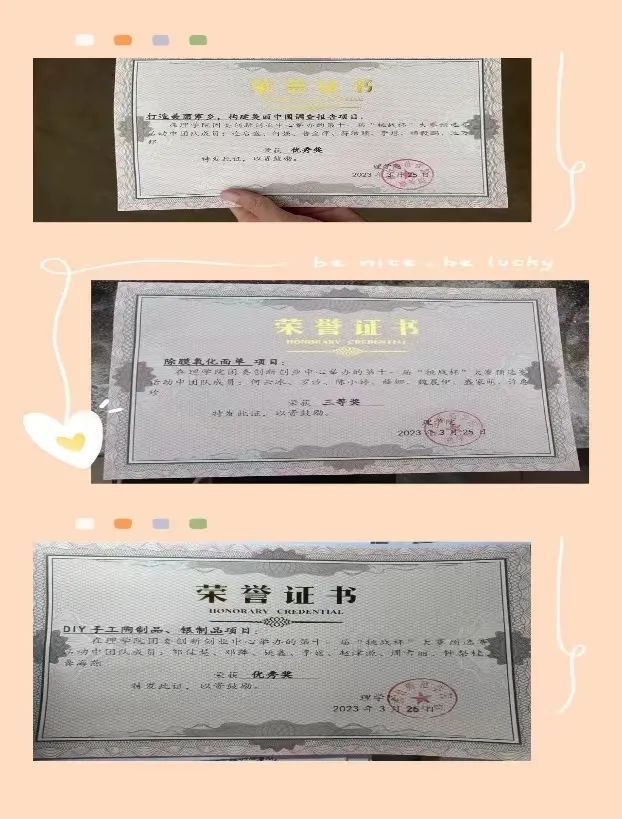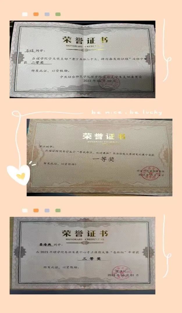 此班更是一支有潜力的队伍!无论是十佳歌手,书法,手工,还是运动,班级同学都积极参与。班级同学还积极参与理学院组织的创新创业大赛,班级总共有两组同学的作品获理学院创新创业三等奖和五组同学的作品获理学院创新创业优秀奖。6班的同学们在这一年里所获奖状据不完全统计足有70张之多(个人和集体),其中十佳歌手一等奖,文明宿舍,理学院迎新杯二等奖,院学生党支部党史答题竞赛一等奖等等。部分奖状材料如下: