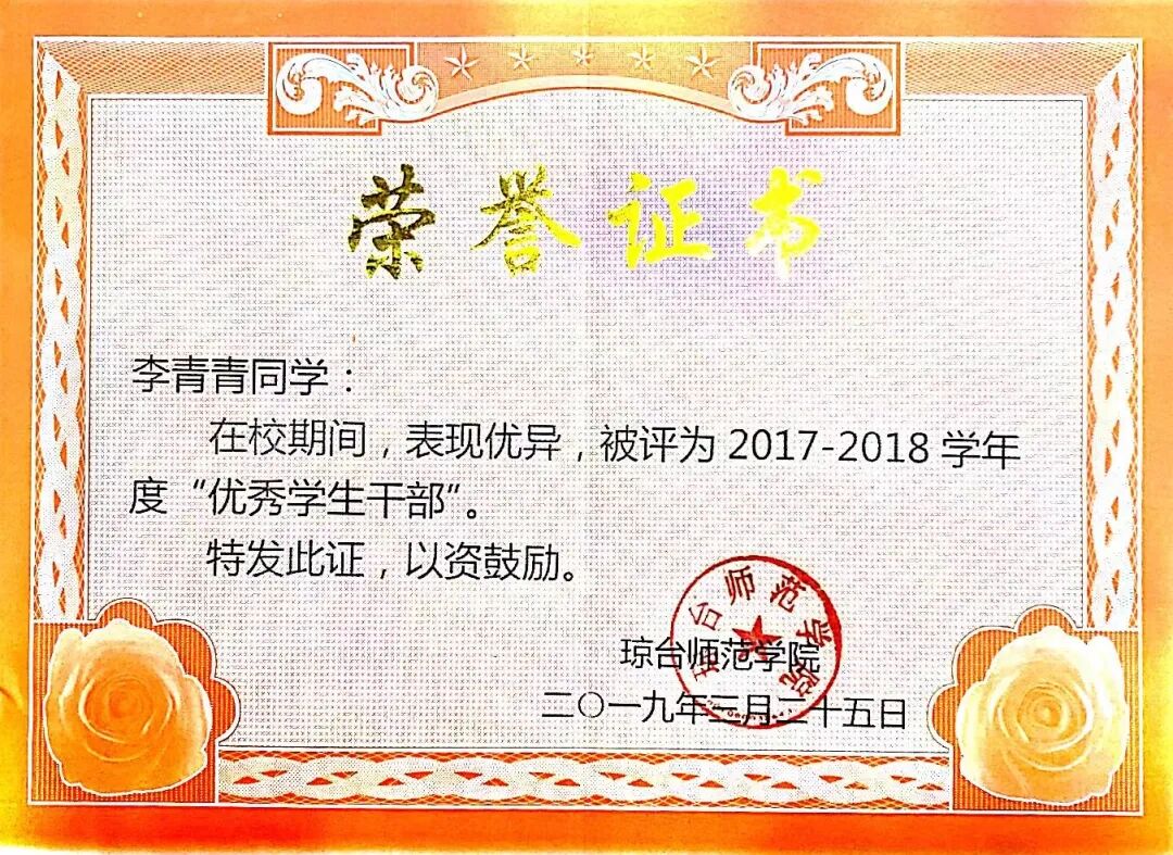 进入大学后,李青青曾任理学院学生会学习部部长、班级团支部书记兼任班长,现任班级组织委员。院系工作上认真负责,服从安排,主动开展活动并协助其他部门组织各项活动,积极配合学院完成工作。班级工作上严于律己,以身作则,努力做好上级组织给她的每项工作,做好了同学的楷模,起到了模范带头作用。在工作中,她忙碌并快乐着,她是同学们的好榜样,是老师的好助手,在校期间年年评为“优秀学生干部”。