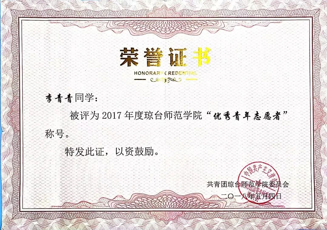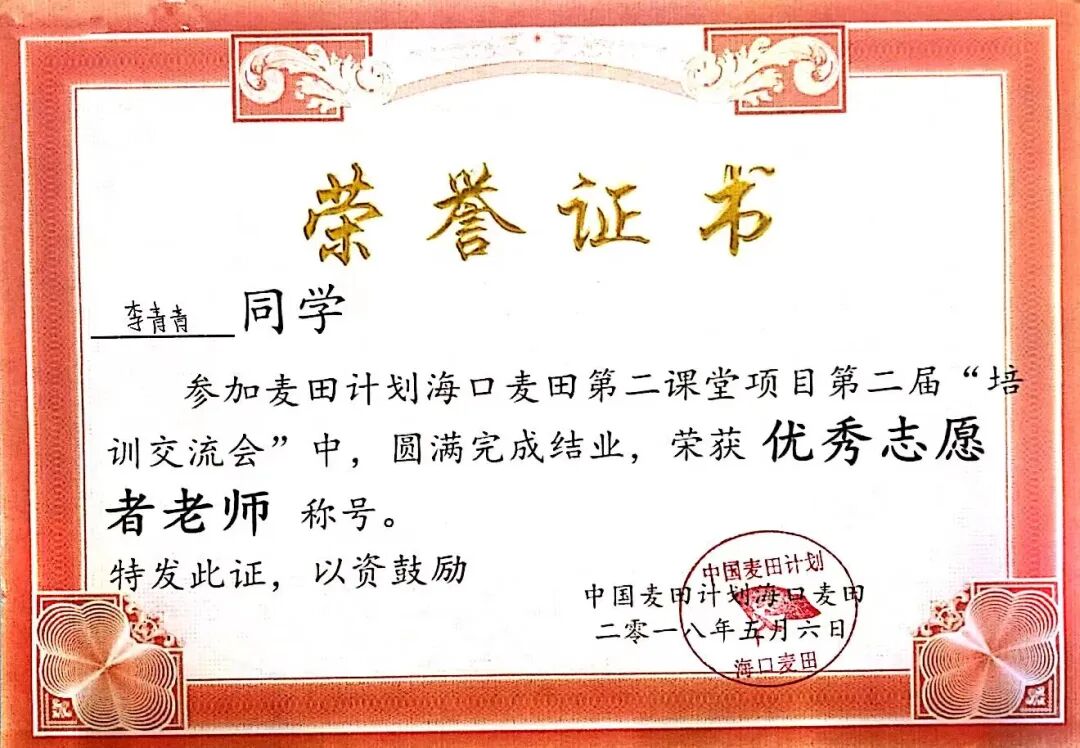2018年5月荣获中国麦田计划海口麦田“优秀志愿者老师”称号