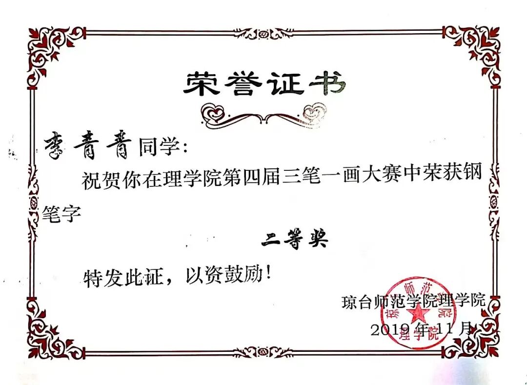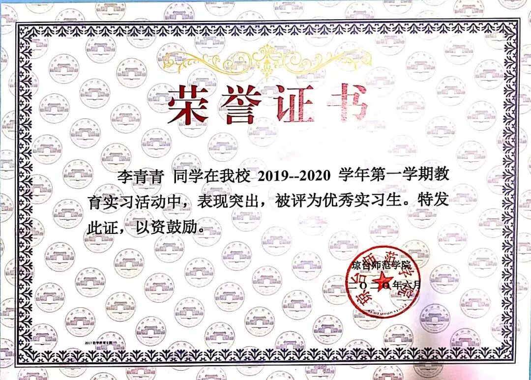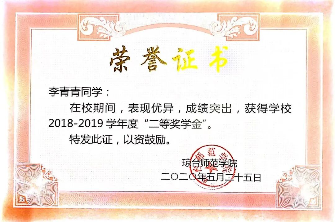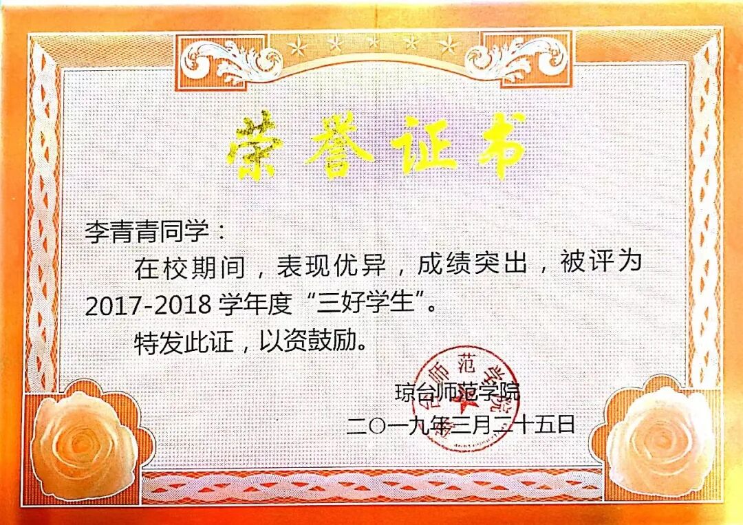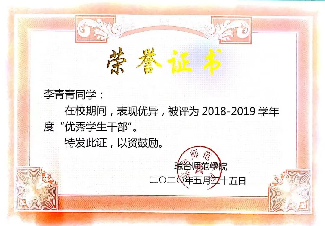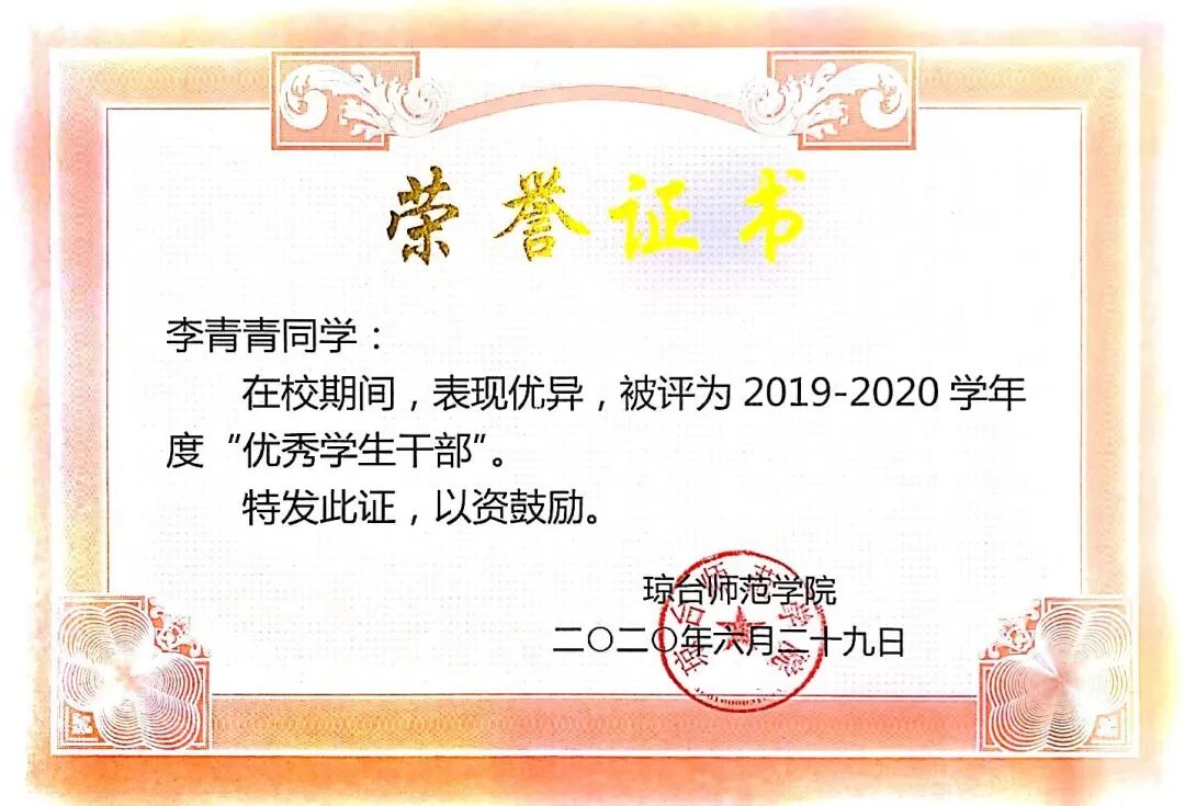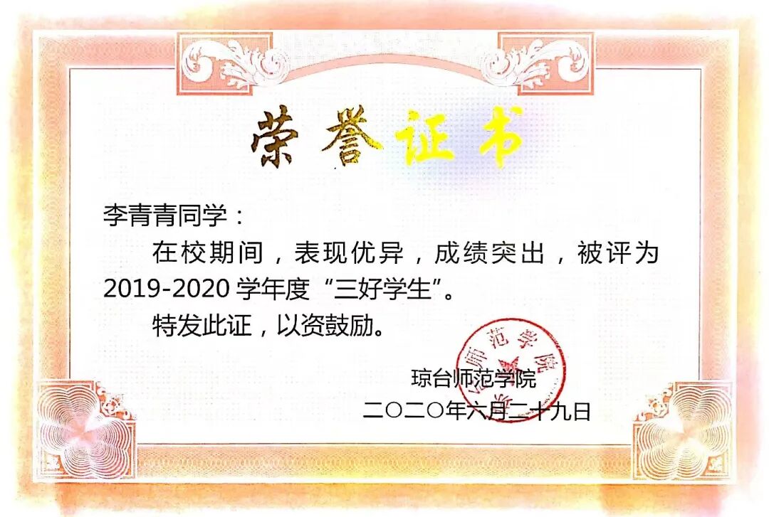 2020年6月荣获琼台师范学院2019-2020学年度“三好学生”