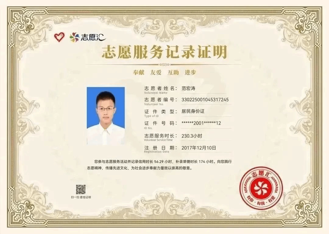 利用课余时间,范宏涛同学还积极参加了不少社会活动和志愿服务。志愿初期,他积极参与我院开展的植树节组织的植树、校运动会等活动,从中感受到奉献的意义和人人一份爱心对于这个社会的帮助,并不断告诉自己要坚持服务的心!随着责任的提升,他牢记服务他人奉献爱心的志愿号召,配合老师策划并开展多次志愿者活动,志愿时长达230余小时。2020年疫情期间,他无时无刻不关注疫情的最新消息,在需要的时候,坚定地站出来,向村里主动报名成为志愿服务队中的一员,主动承担起登记来往人员信息和测量体温的任务,负责在村口当志愿者,排查进出村村民体温并登记。