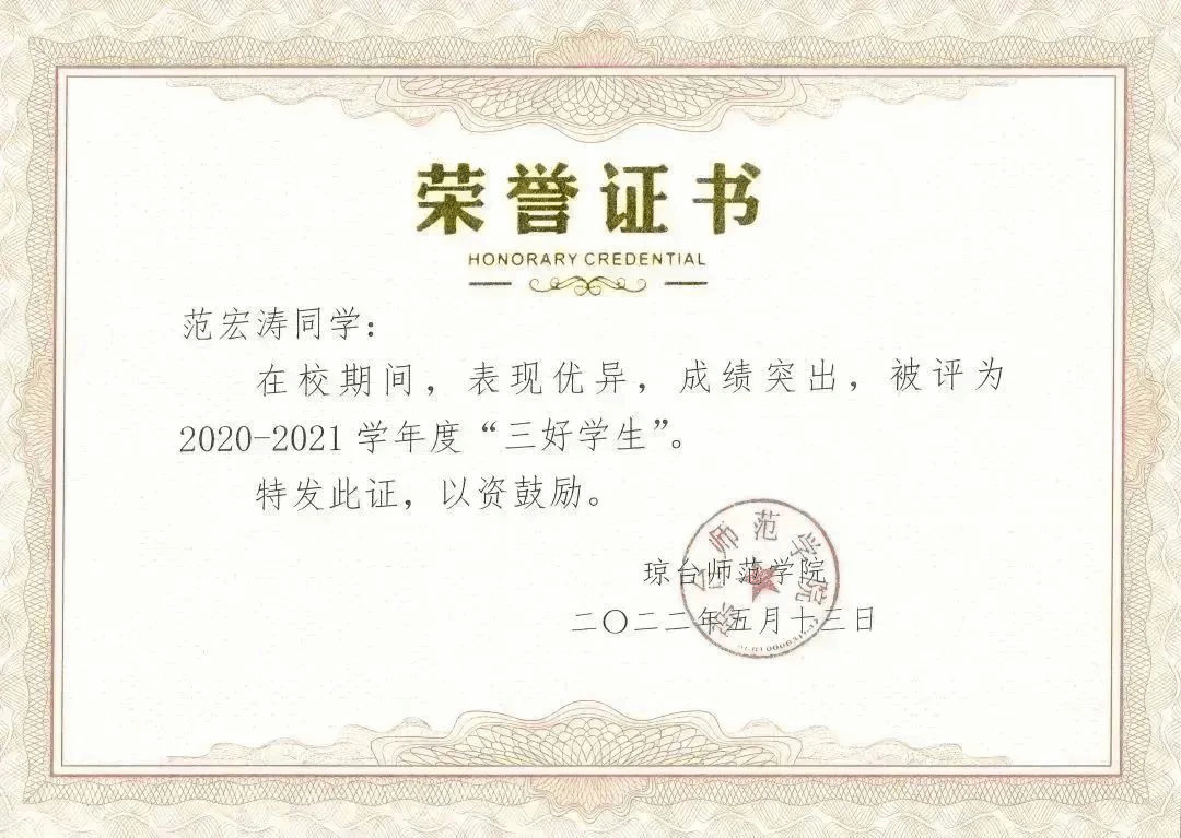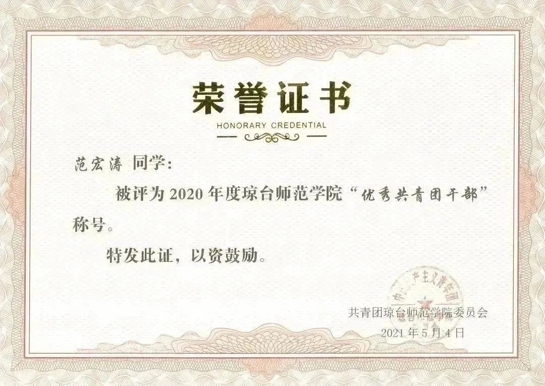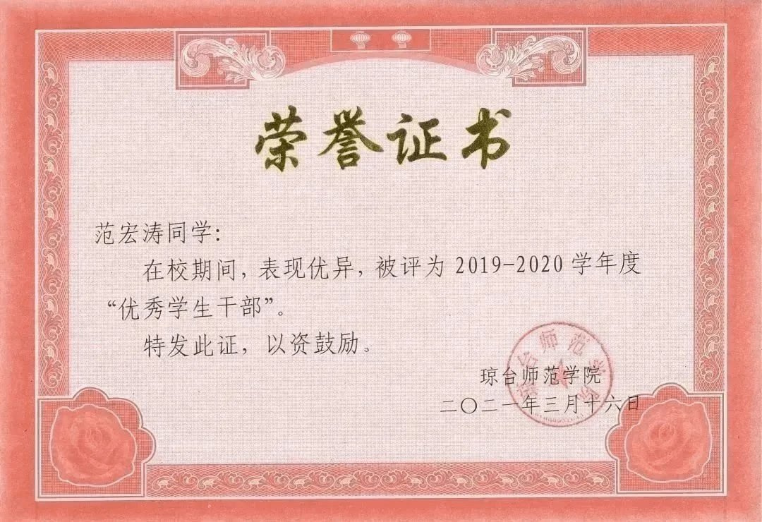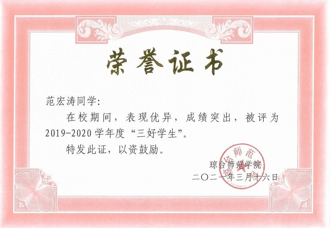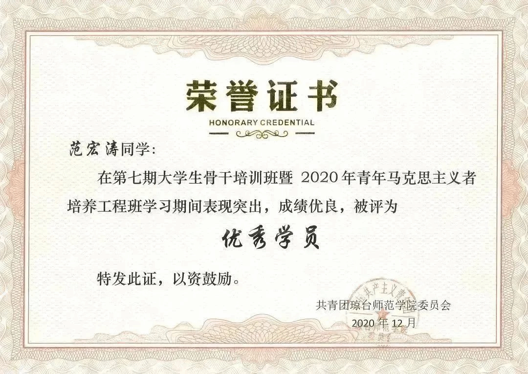 范宏涛同学在思想上积极要求进步,树立了良好的人生观和道德观,并积极响应中国共产党的号召,努力向党组织靠拢。于此同时,作为中共党员的他还不断鼓励、帮助身边想申请入党的同学。他不懈努力,通过了党课的培训,工作的同时保持良好的学习成绩,他深刻体会到党员所肩负的重任,要想成为一名党员,就要时刻本着“全心全意为人民服务”的宗旨,就要以实际行动来鼓舞大家,发挥党员的先锋模范作用。他深深知道,重要的不在于形式,而在于自己的实际行动。自习近平总书记提出“中国梦”以来,他积极响应号召,先后配合学院组织并参加主题诗朗诵比赛等各类活动,在2020年青年马克思主义者培训工程班中被评为优秀学员,被评为2021年度“海南省大学生自强之星”。
