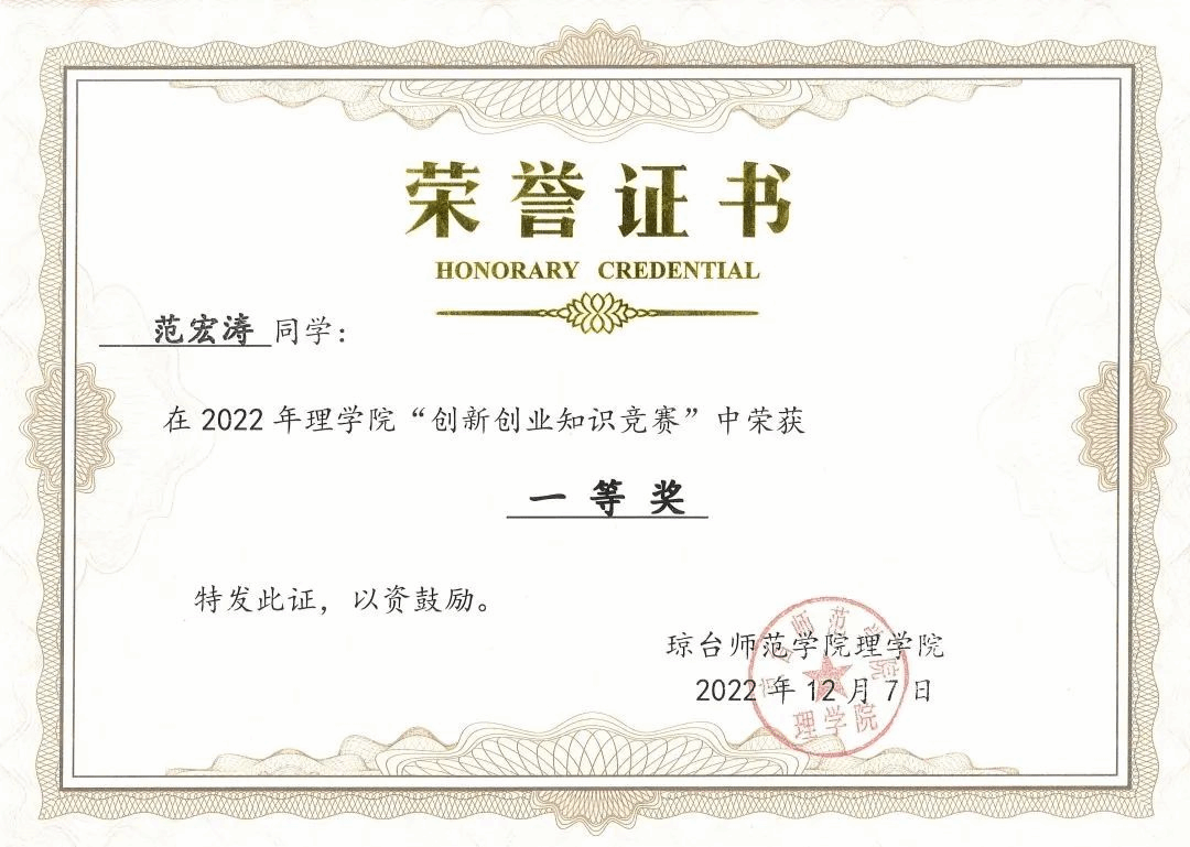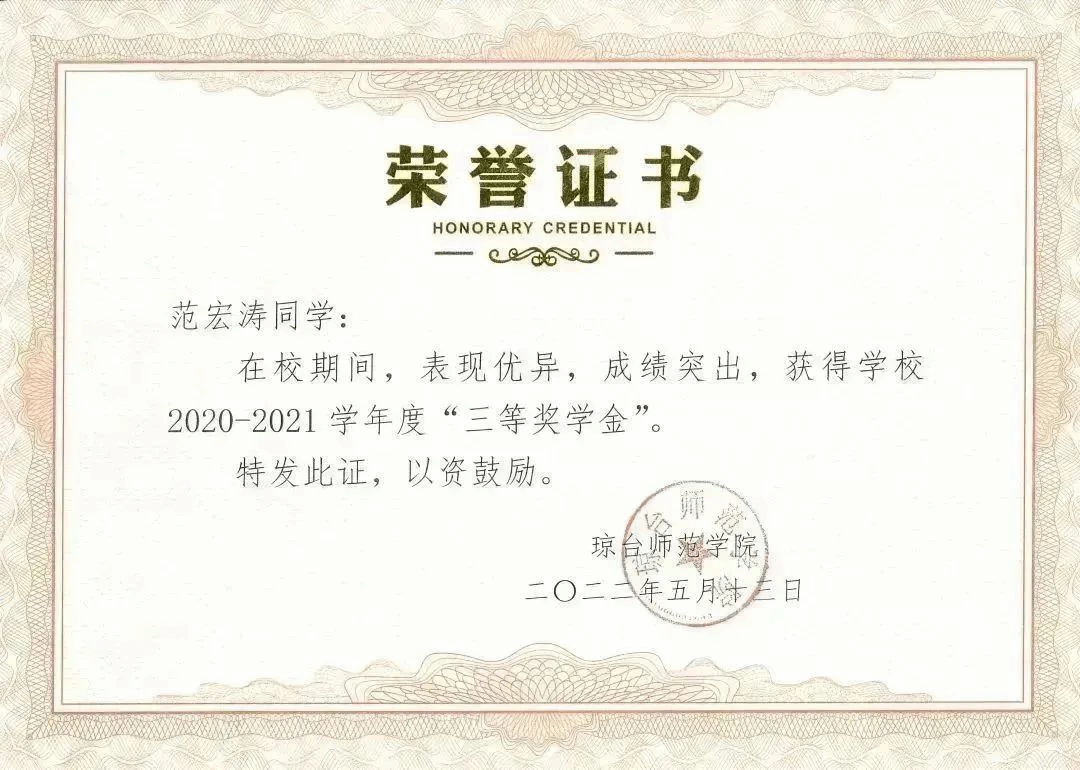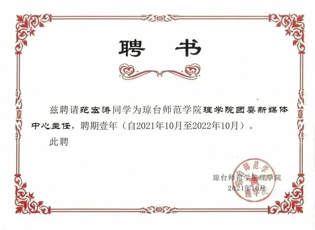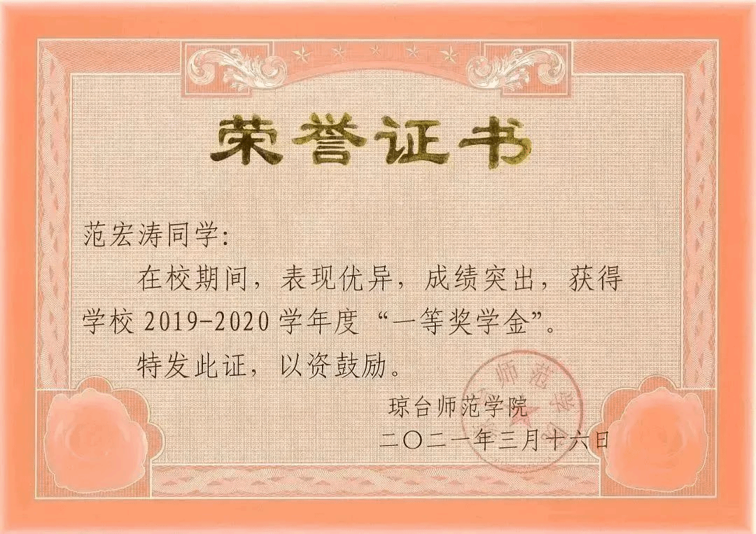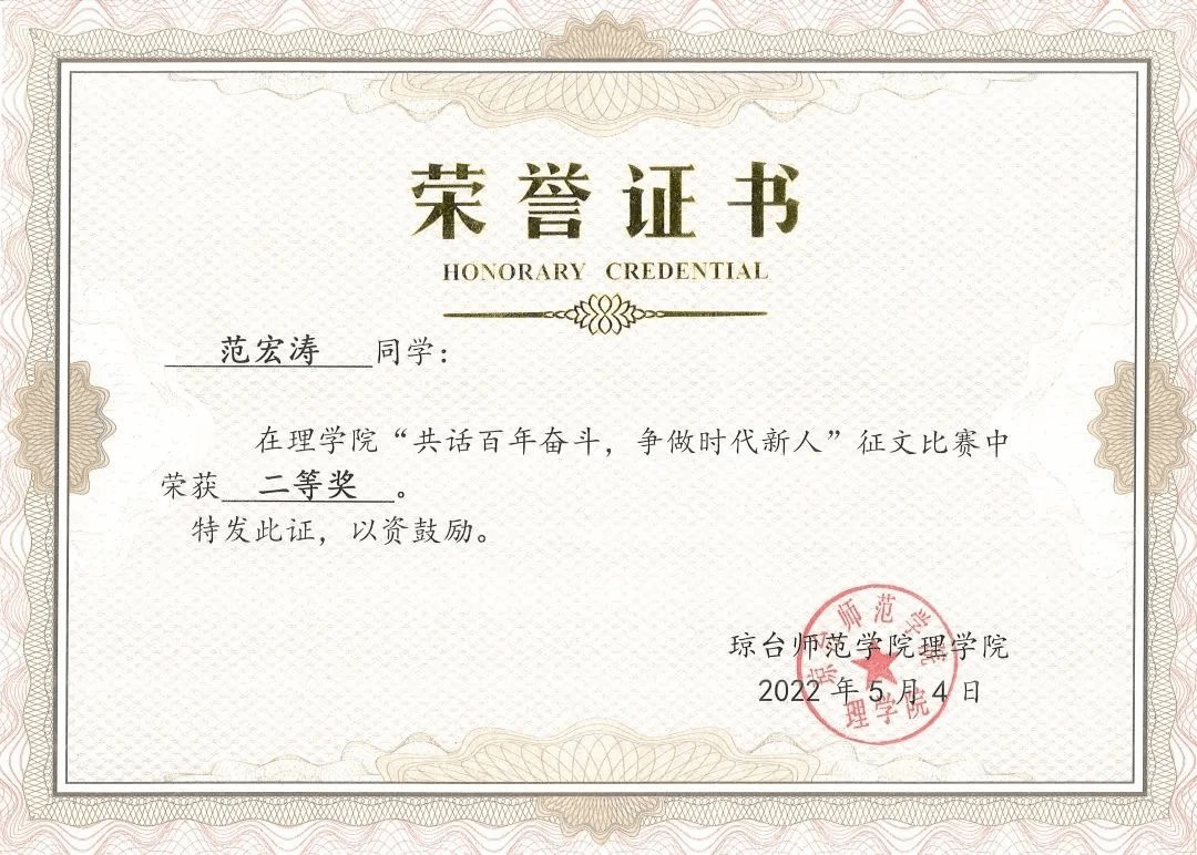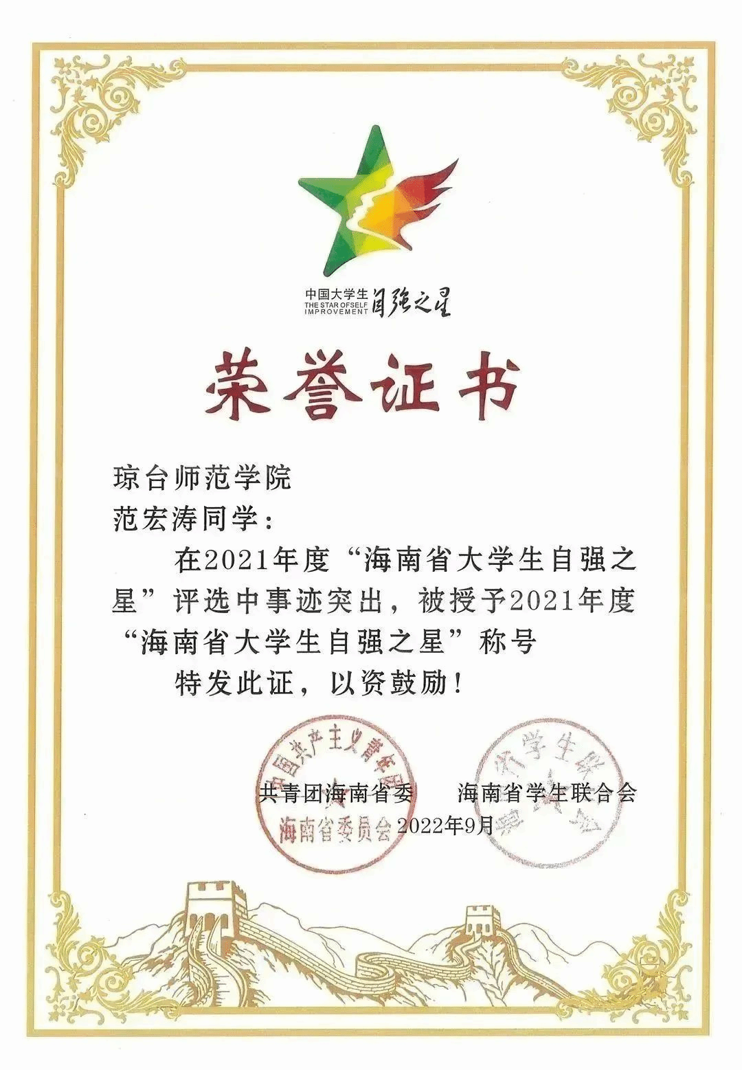范宏涛同学在思想上积极要求进步,树立了良好的人生观和道德观,并积极响应中国共产党的号召,努力向党组织靠拢。于此同时,作为中共党员的他还不断鼓励、帮助身边想申请入党的同学。他不懈努力,通过了党课的培训,工作的同时保持良好的学习成绩,他深刻体会到党员所肩负的重任,要想成为一名党员,就要时刻本着“全心全意为人民服务”的宗旨,就要以实际行动来鼓舞大家,发挥党员的先锋模范作用。他深深知道,重要的不在于形式,而在于自己的实际行动。自习近平总书记提出“中国梦”以来,他积极响应号召,先后配合学院组织并参加主题诗朗诵比赛等各类活动,在2020年青年马克思主义者培训工程班中被评为优秀学员,被评为2021年度“海南省大学生自强之星”。
