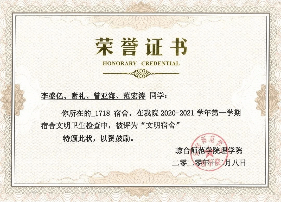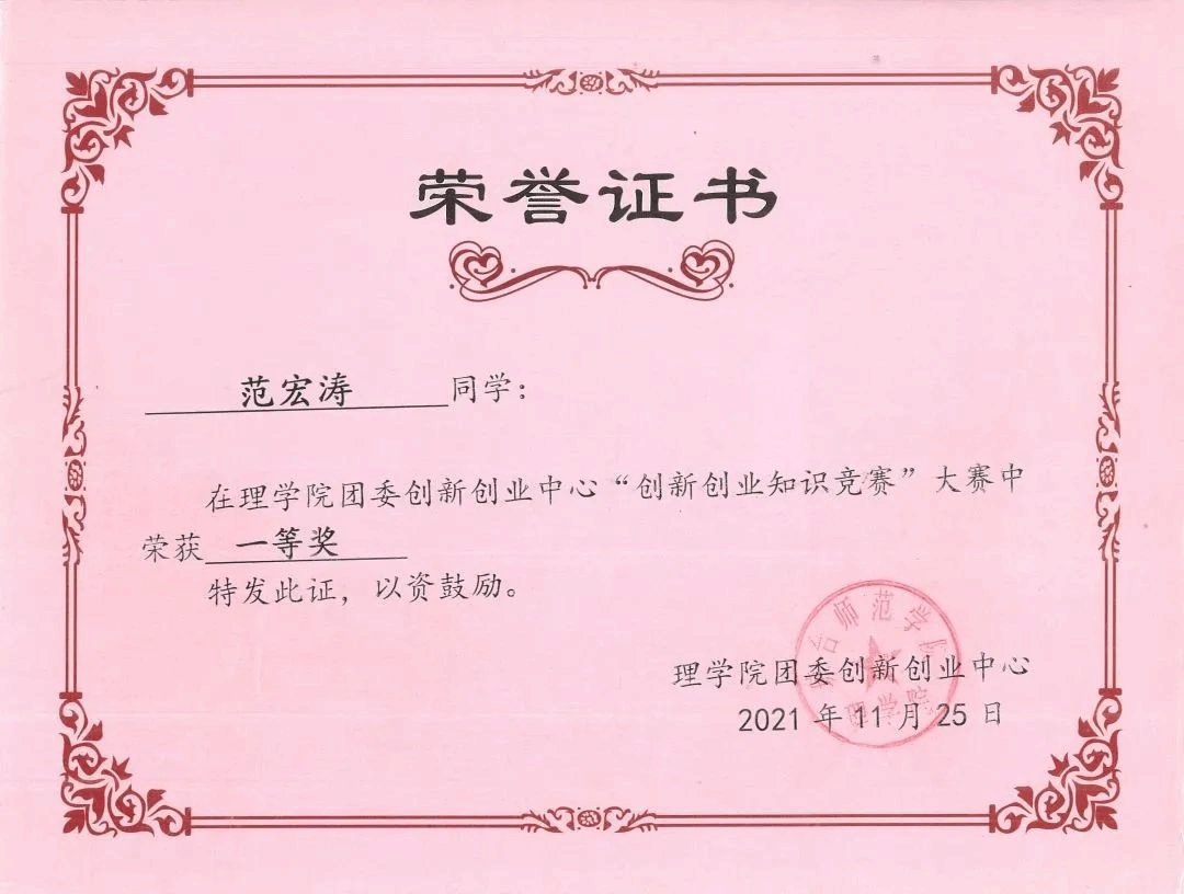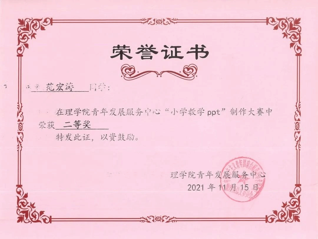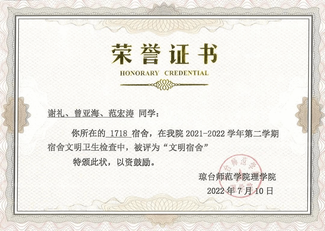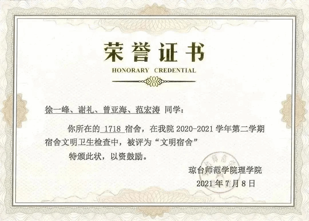 范宏涛同学在思想上积极要求进步,树立了良好的人生观和道德观,并积极响应中国共产党的号召,努力向党组织靠拢。于此同时,作为中共党员的他还不断鼓励、帮助身边想申请入党的同学。他不懈努力,通过了党课的培训,工作的同时保持良好的学习成绩,他深刻体会到党员所肩负的重任,要想成为一名党员,就要时刻本着“全心全意为人民服务”的宗旨,就要以实际行动来鼓舞大家,发挥党员的先锋模范作用。他深深知道,重要的不在于形式,而在于自己的实际行动。自习近平总书记提出“中国梦”以来,他积极响应号召,先后配合学院组织并参加主题诗朗诵比赛等各类活动,在2020年青年马克思主义者培训工程班中被评为优秀学员,被评为2021年度“海南省大学生自强之星”。