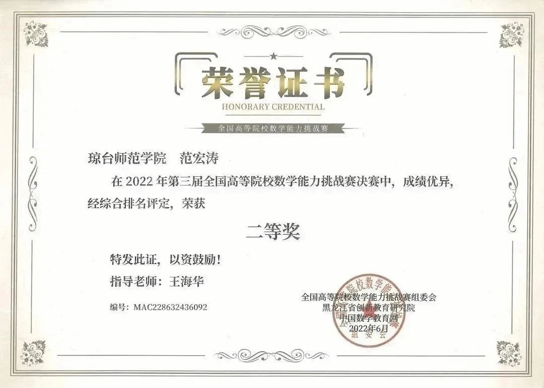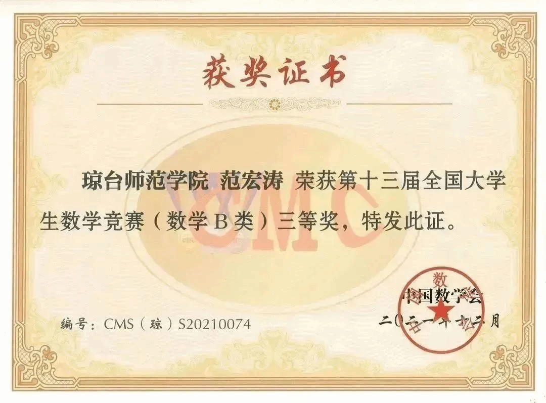 他积极参加各类活动,其中大学生创新创业项目成功申报为国家级项目,并于2021年11月顺利结项。2021年全国大学生数学建模竞赛中获得海南赛区二等奖。荣获第十三届全国大学生数学竞赛(数学B类)三等奖。在2022年第三届全国高等院校数学能力挑战赛中荣获初赛三等奖、决赛二等奖的成绩。