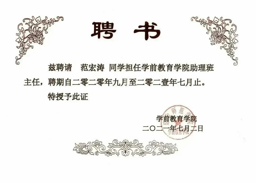 进入大二之时,他被聘为2020学前教育1班代理班主任,负责新生班的日常工作指导和学生思想疏导。因此,他在各方面更加严格要求自己,力求自己做好模范带头作用,正确、积极的引导2020级新生尽快地适应大学生活。