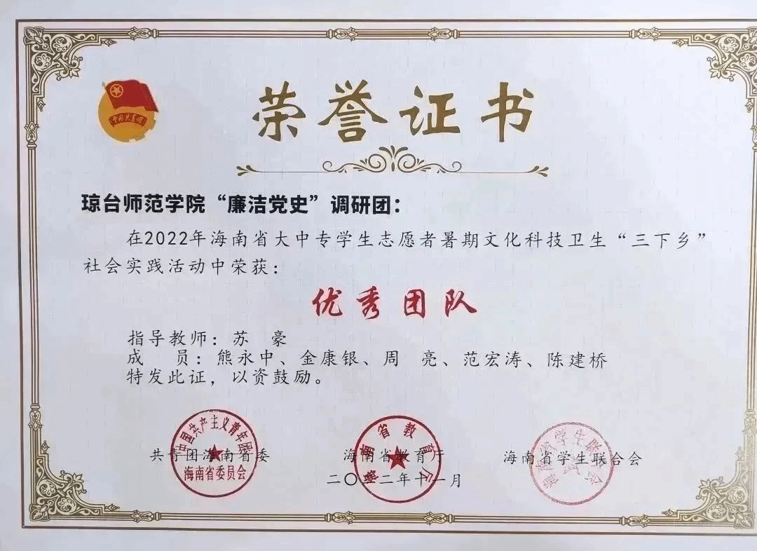 他积极参加暑期社会实践活动,在2021年、2022年分别暑期社会实践中带头成立琼台师范学院理学院“红色文化在我心中”社会实践团——海口站、东方站,投身红色文化对周边居民的辐射影响调查,为琼台红色文化更好地走出去做出贡献,实践内容分别获得省级重点、校级重点立项。另外,他还投身于琼台师范学院廉洁党史调研团,做好团队的宣传工作,所在团队被评为三下乡优秀团队,他参与撰写的实践报告被评为三下乡优秀成果,本人被评为三下乡学生积极分子。