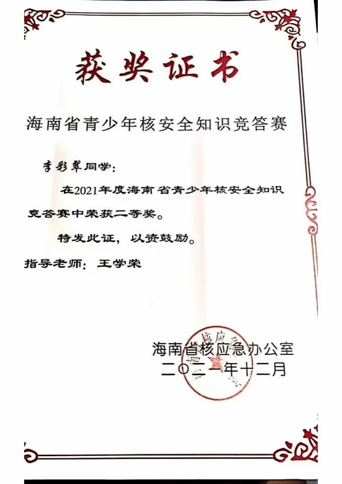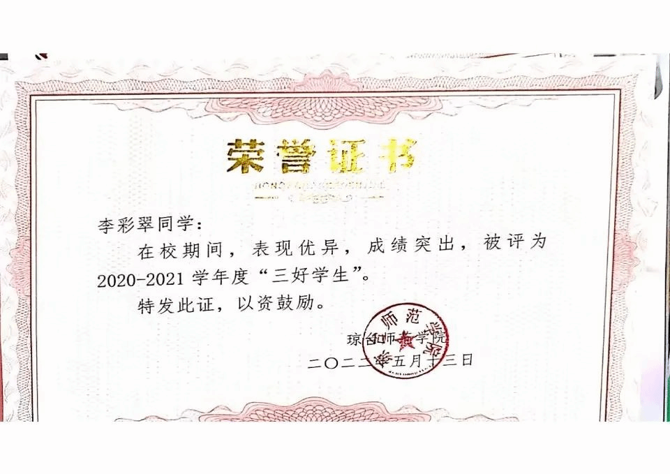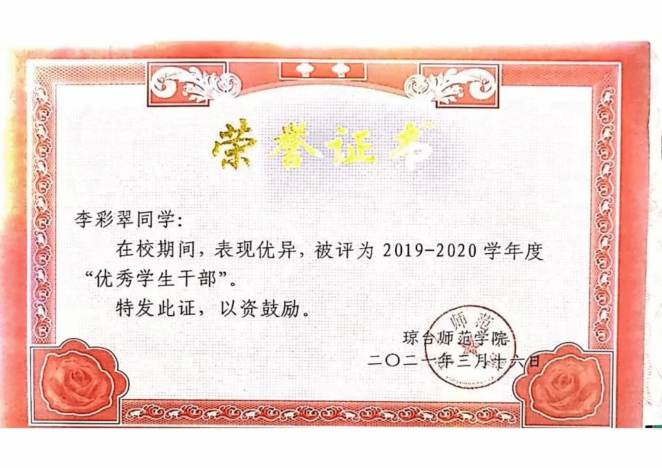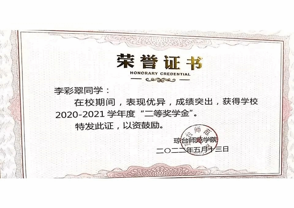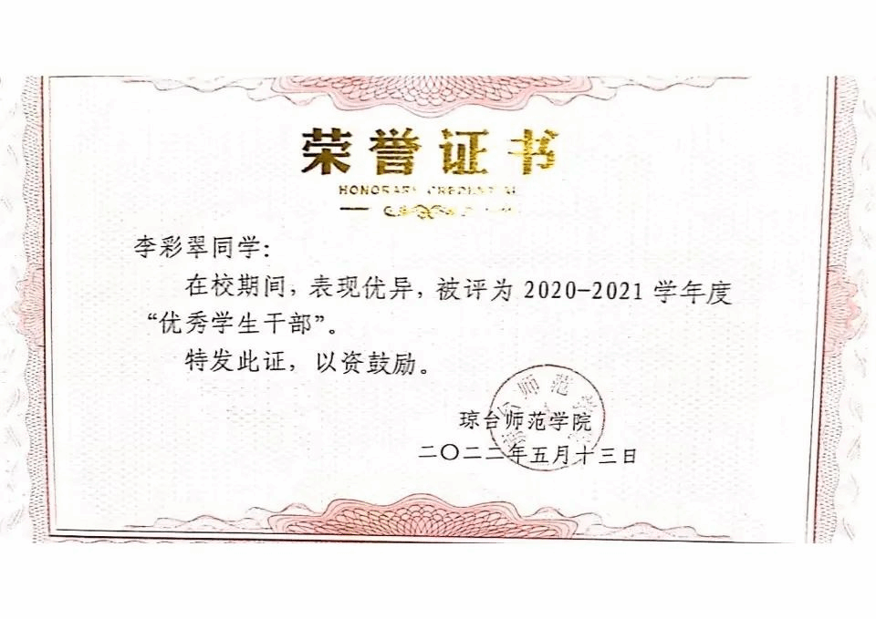 刘禹锡有言:“以不息为体,以日新为道。”既把勤奋不息当作根本,把每天取得进步特别努力的方向。在大学期间,李彩翠同学积极对待每一门课程,并取得了优异的学习成绩,曾获得2020-2021年度“三好学生”、2020-2021年度“二等奖学金”,2021-2022年度“三好学生”2021-2022年度“一等奖学金”、理学院第十三届“挑战杯”大赛初选二等奖、中美青年创客大赛海口分赛区选拔赛二等奖等多项荣誉。