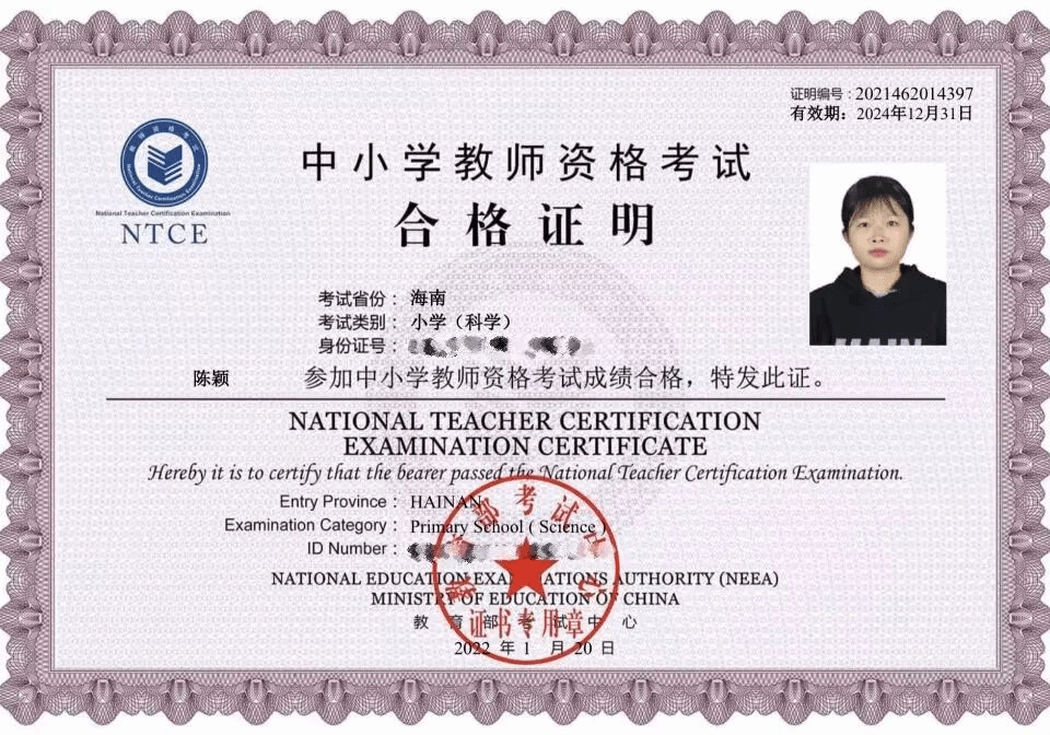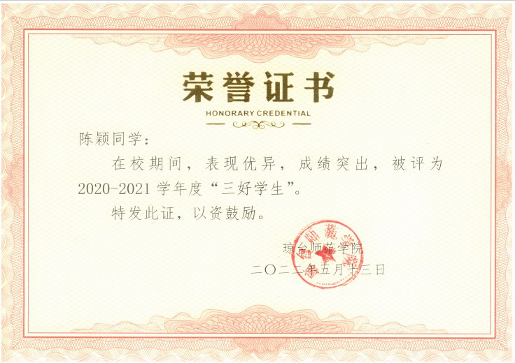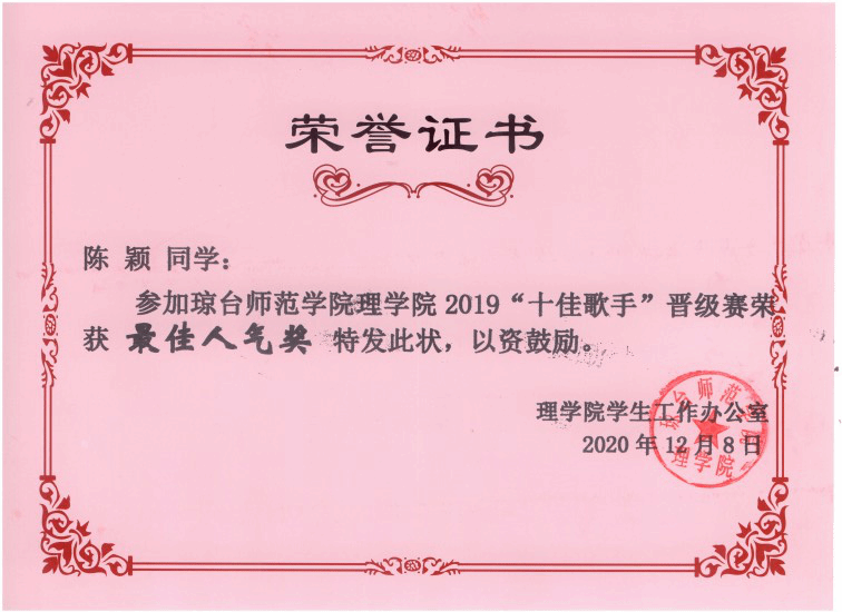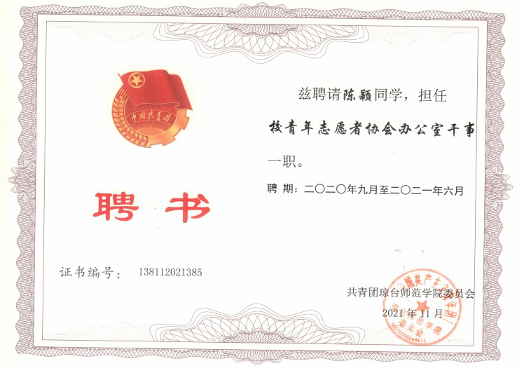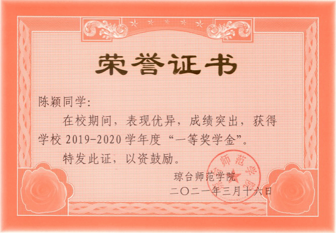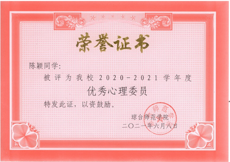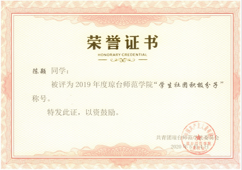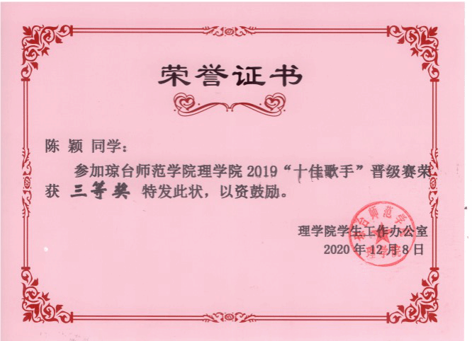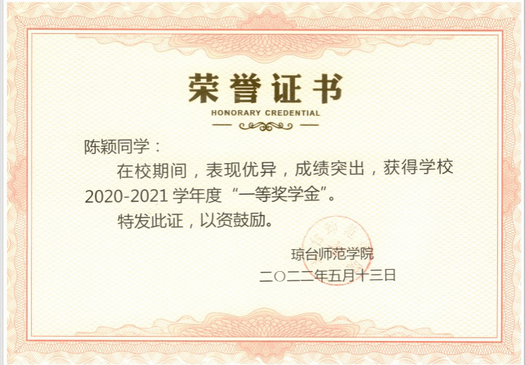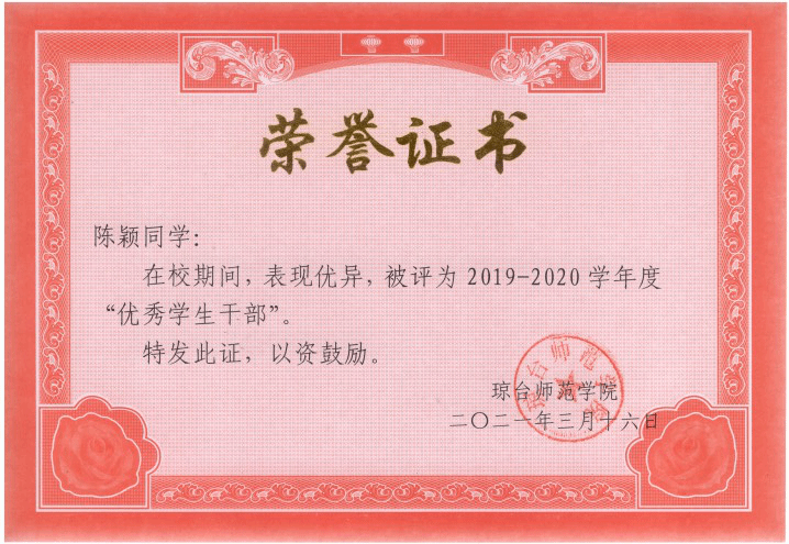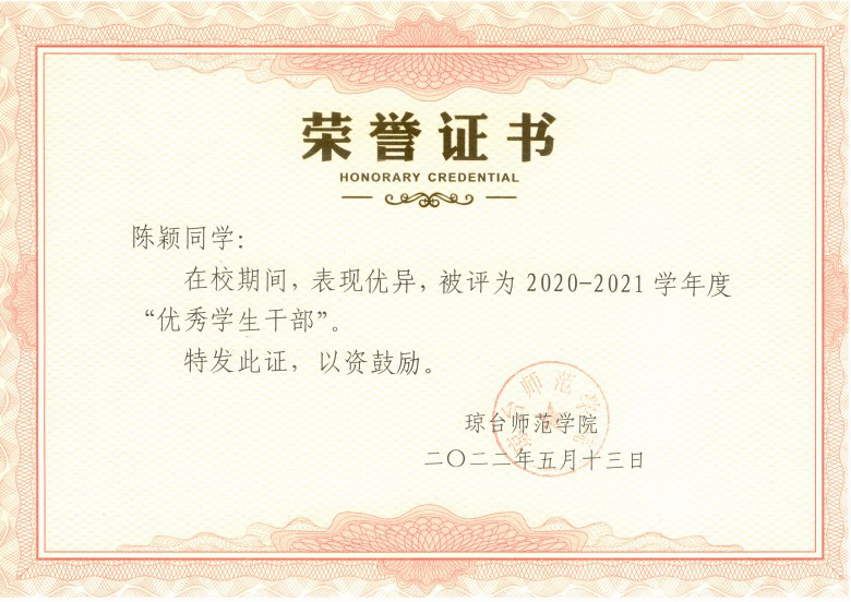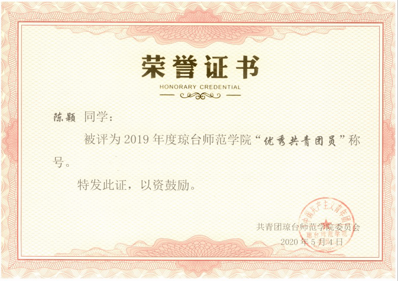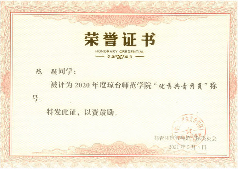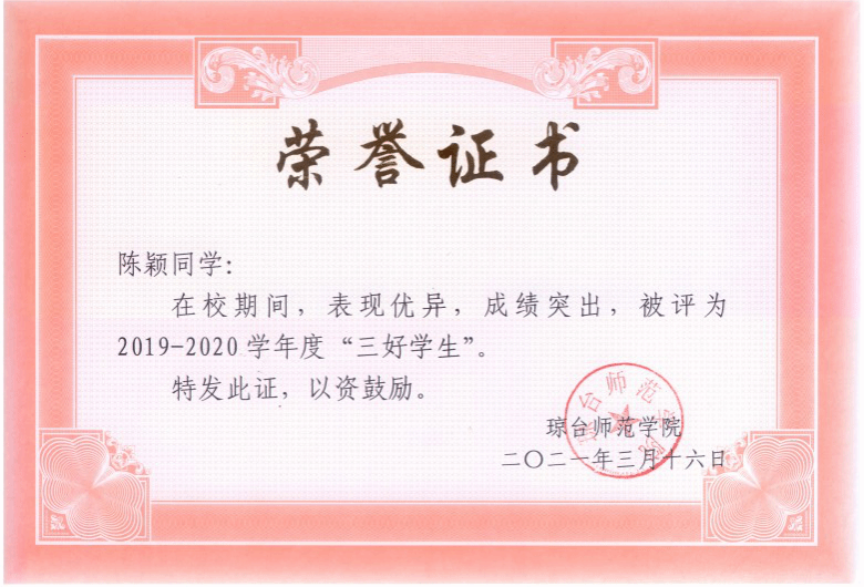学习上,陈颖同学积极主动,先后通过CET-4和CET-6,取得普通话二甲证书、计算机二级证书、小学科学教师资格证;在五四评优期间,她连续两年获得校级“优秀共青团员”。同时,她积极参加大学生创新创业项目以及一些省级竞赛,获得“2021年海南省核安全知识竞赛三等奖”和“2022年中美青创杯海南省二等奖”。一个个证书是她努力的印记,是用她的汗水换来的勋章。