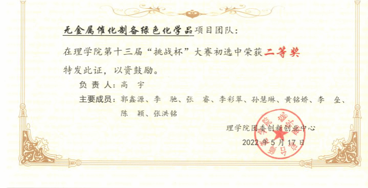 作为一名生物科学的学生,她也时刻牢记动手能力的重要性,无论是在学业还是实验上,她都以十分认真的态度对待并且踏实完成,在绿色材料及新能源应用团队老师的带领下,参与并发表SCI共同一作论文一篇、申请专利一项。在大学期间连续三年获得一等奖学金、三好学生和优秀班干部的荣誉称号和2022年国家奖学金。
