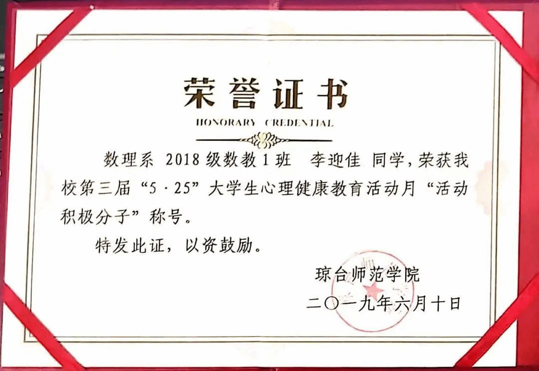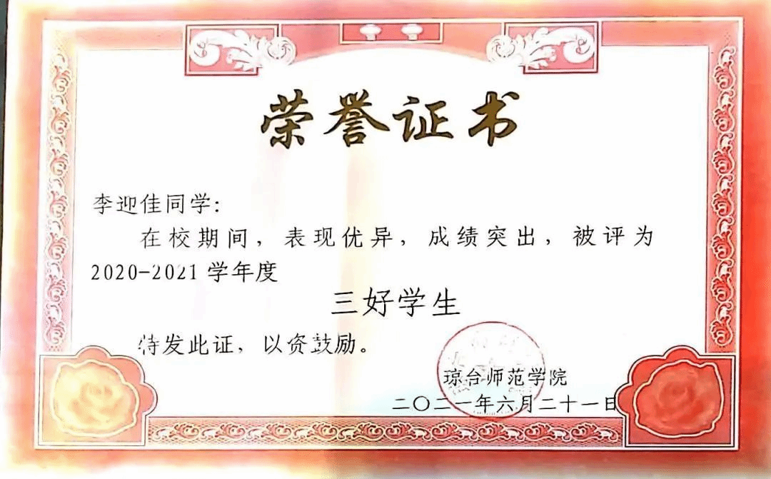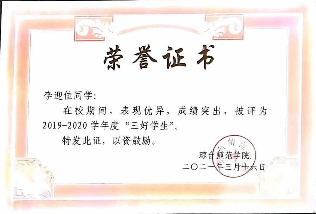 “海压竹枝低复举,风吹山角晦还明”。在学习上,李迎佳同学始终相信“做好准备的人会得到一颗糖”,凭着对知识的渴望和追求,一向严于律己,刻苦钻研,勤奋好学,态度端正,目标明确,连续四年获得了“三好学生”、还获得了“优秀班干部”、“优秀学生会干部”、“优秀共青团员”、“优秀毕业生”等多项荣誉称号。“山不让尘,川不辞盈。”为提升自己的专业知识,李迎佳积极参加各项比赛,在决定参加全国大学生数学建模大赛后,一路从校赛到省赛,在理科楼熬了无数个日日夜夜,从前期跟校进行培训,到后期自己查阅资料,“理科楼的灯火通明也有我的一份功劳,很荣幸自己在省赛中获得了二等奖,也算是给了自己那些夜以继日一个交代。”现在想来她或许也不知道自己是如何熬过那些寂静无声的黑夜的,明明自己是一个那么怕黑、又爱热闹的人。“或许这就是热情吧!因为是自己喜欢的专业,所以充满一往无前的勇气。”