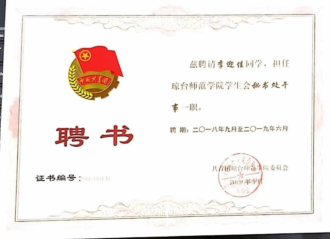 “学生工作于我而言不仅是一份责任,更是一份情怀。”大学里,李迎佳同学先后担任琼台师范学院校级学生会秘书处干事、综合管理部副部长。她自己也记不清自己曾在行政楼加了多少个班,也记不清见证过多少次琼台的日出。她只记得行政楼106的地板很凉,需要多垫两层塑料才能睡的舒坦;记得彻夜响个不停的打印机,总担心它明天就罢工;记得键盘的敲击声,一个文档没保存能让一个部门急的上火。也记得举办周末舞会时担心没人上台在前面尬跳的窘迫;记得举办游园会时看见同学兑奖时扬起笑脸的满足;记得举办元旦晚会时直播顺利结束的热泪盈眶。“原来我跟琼台的羁绊已经这么深了啊,这一路磕磕绊绊,但还是看见了繁花盛开。”