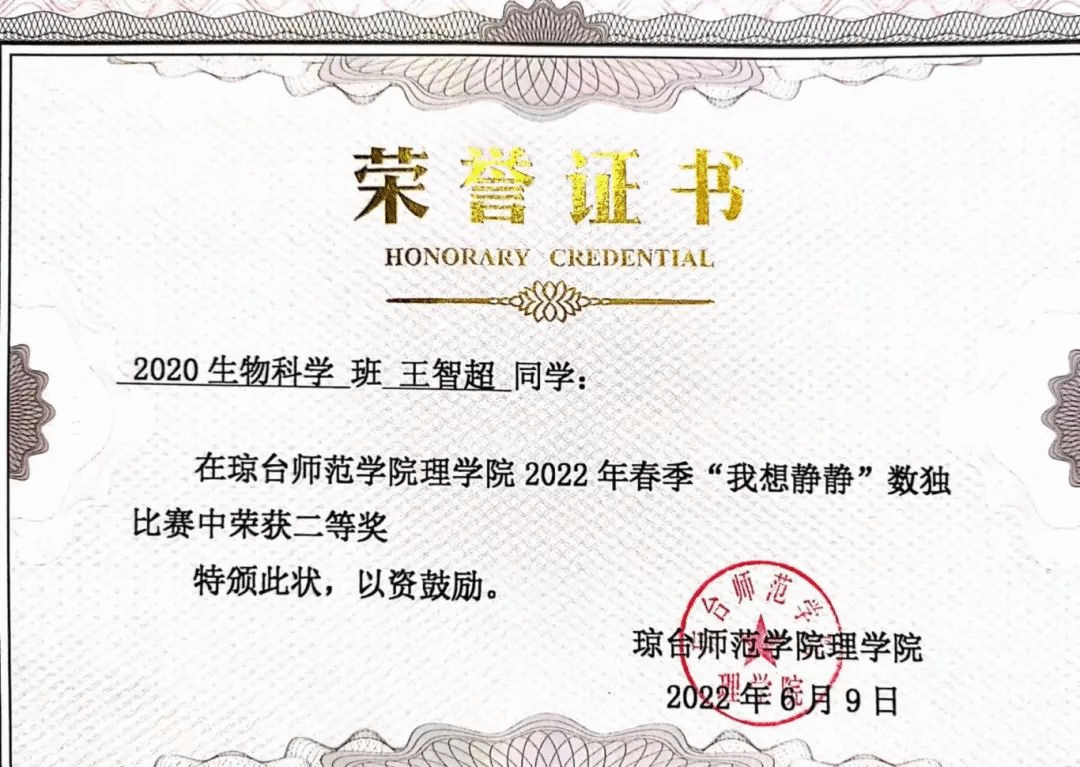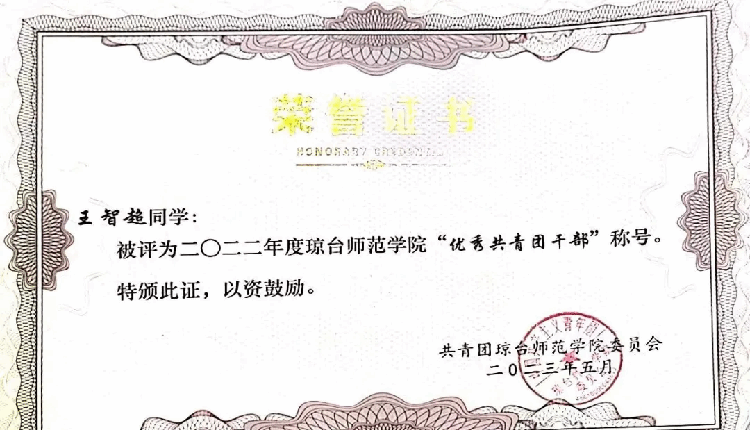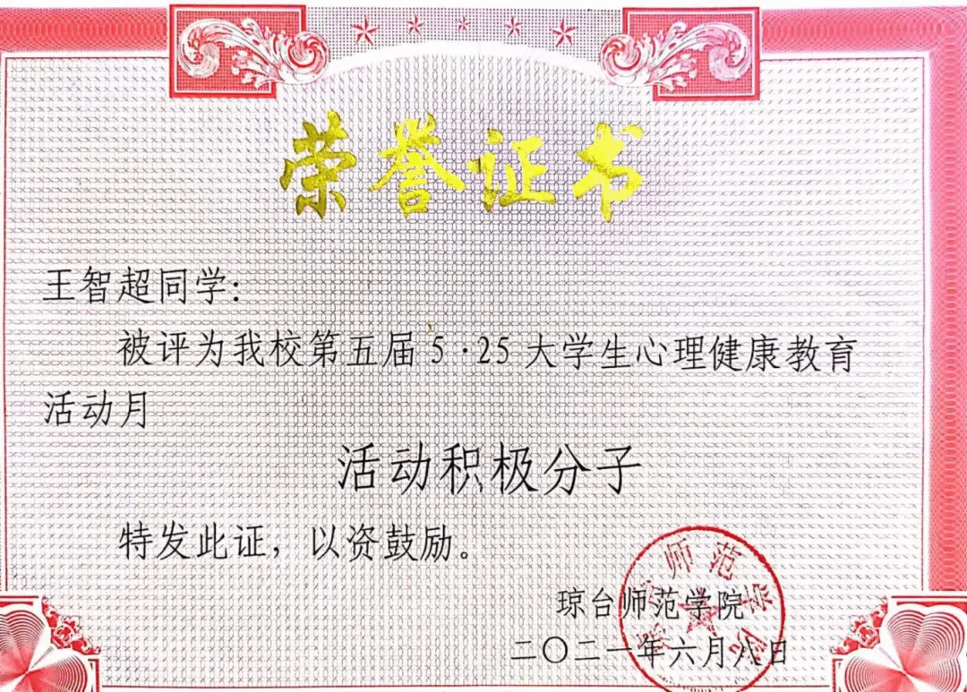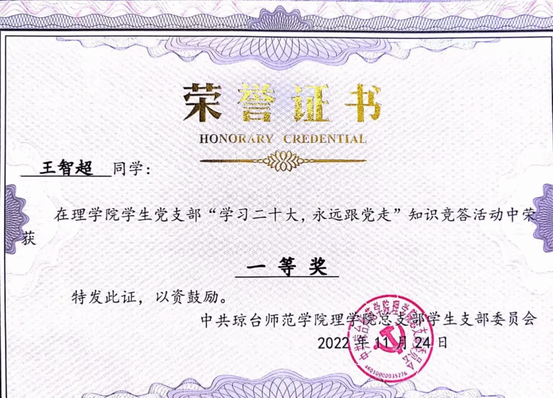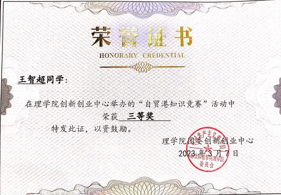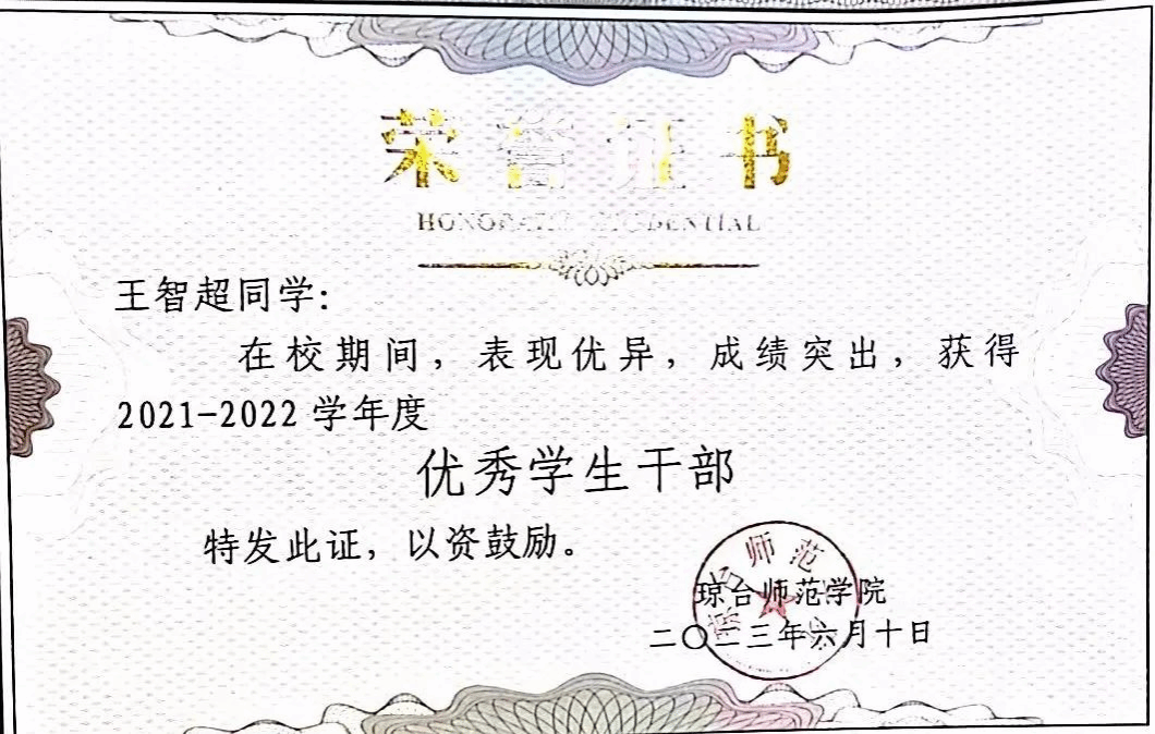 在学习方面,王智超同学始终怀着对知识的渴望和追求。取得了普通话二级乙等证书,英语CET-4证书,积极参加大学生创新创业项目以及一些知识竞赛,不断充实自己的知识储备,不断拓展自己的学识面。无论是在校园里还是在社会中,他都保持着学习的姿态,不断充实自己的学识。他善于总结经验,善于从失败中吸取教训,不断完善自己。他勤奋好学,对待学习充满热情,始终保持着对知识的敬畏之心。学无止境,学习是一项漫长的过程。