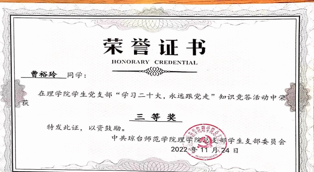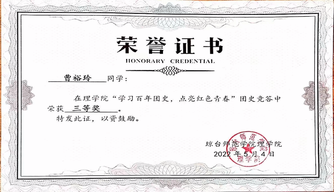 2022年获理学院“学习百年团史,点亮红色青春”团史竞答三等奖