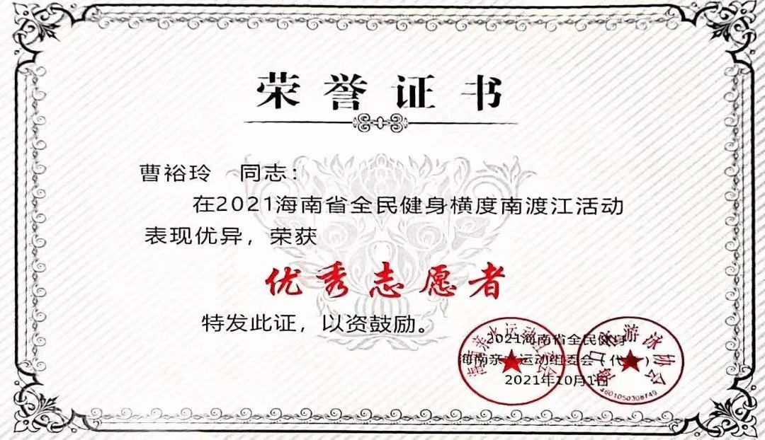 2021年获海南省全民健身横渡南渡江“优秀志愿者”