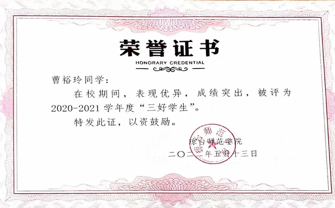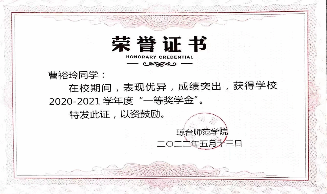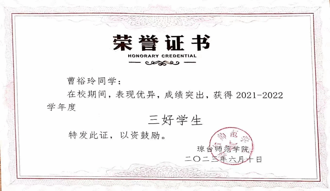 曹裕玲同学坚持以学业为重,始终严格要求自己,刻苦钻研,勤奋好学,态度端正,不忘初心,努力学习专业知识,掌握专业知识和技能,同时她还注意多方面知识的拓展,提高自身综合素质,珍惜学习机会,经过大学四年的学习,"读万卷书,行万里路",凭借自己对知识的渴望与追求,具备一定的自学能力和综合分析能力,保质保量的完成了每一门科目的学习。在大学期间,她连续三次获得校级一等奖学金和“三好学生”荣誉称号,通过了大学英语四六级,考取了小学数学教师资格证。