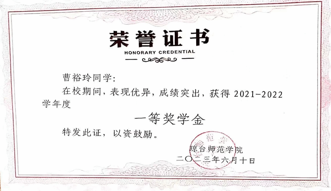 2021-2022学年度校一等奖学金