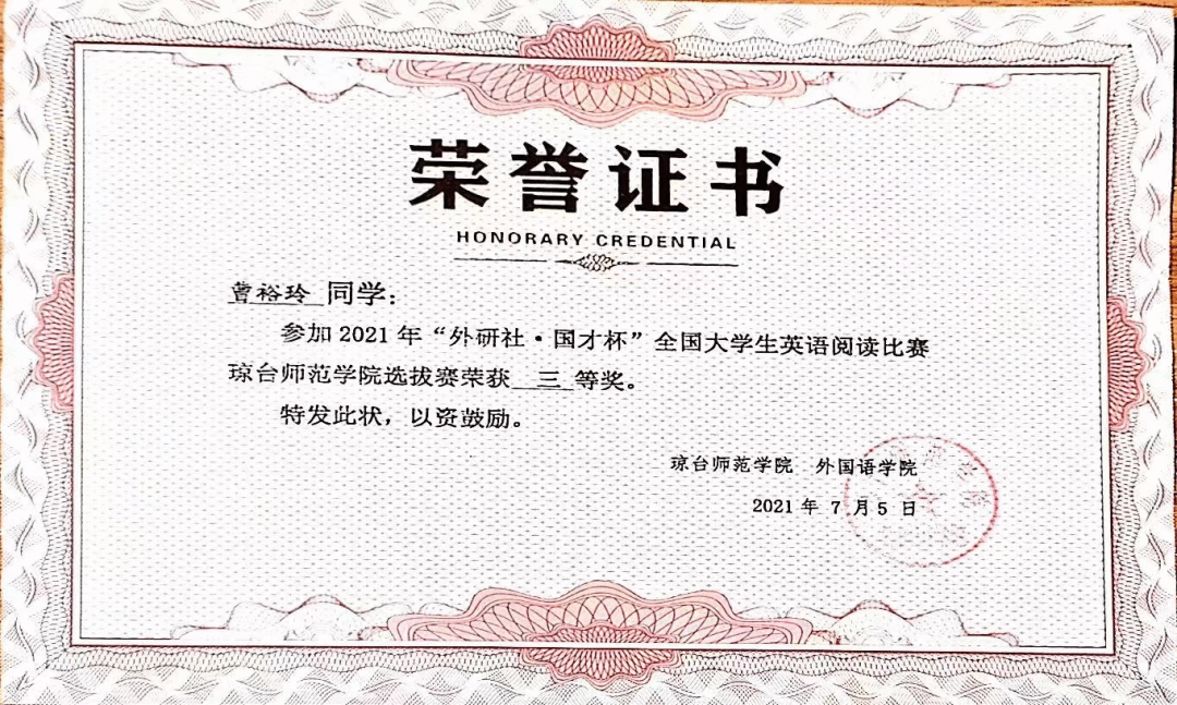 2021年获“外研社国才杯”全国大学生英语阅读比赛校选拔赛三等奖