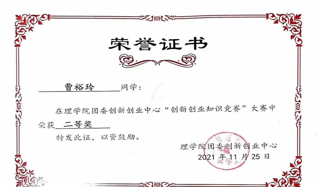 2021年获理学院“创新创业知识竞赛”二等奖