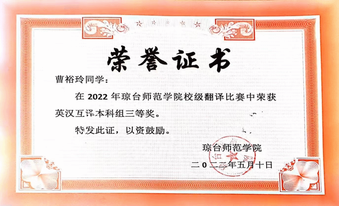 2022年获校级翻译比赛英汉互译本科组三等奖