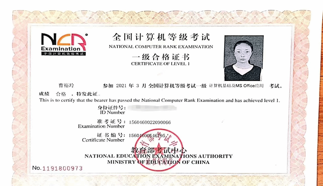 2021年3月获得全国计算机等级考试一级合格证书