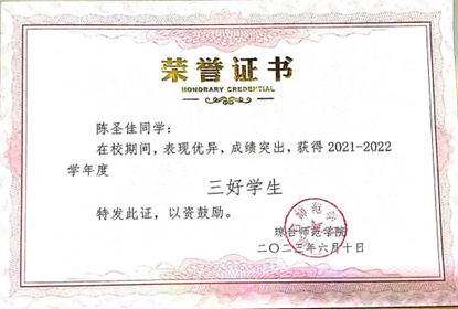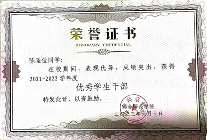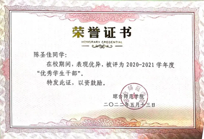 2021-2022学年荣获琼台师范学院“优秀学生干部”、“三好学生”荣誉称号