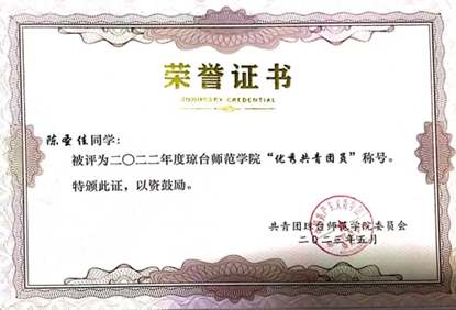 2022年度荣获琼台师范学院“优秀共青团员”荣誉称号