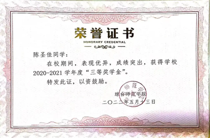 2020-2021学年荣获琼台师范学院“三等奖学金”