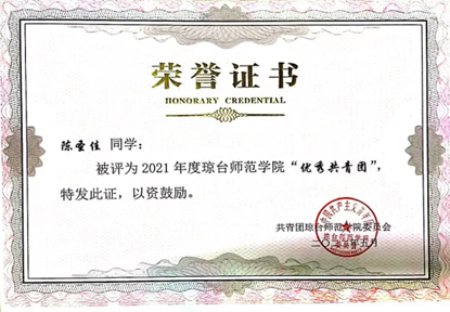 2021年度荣获琼台师范学院“优秀共青团员”荣誉称号