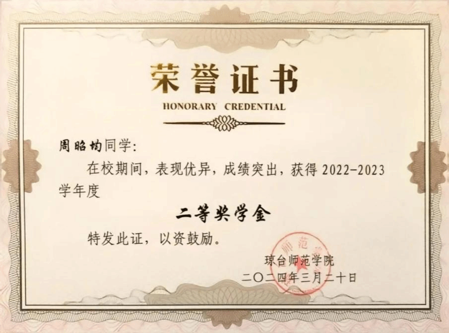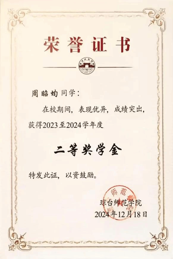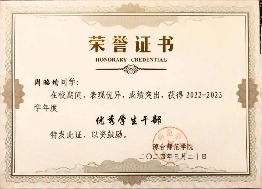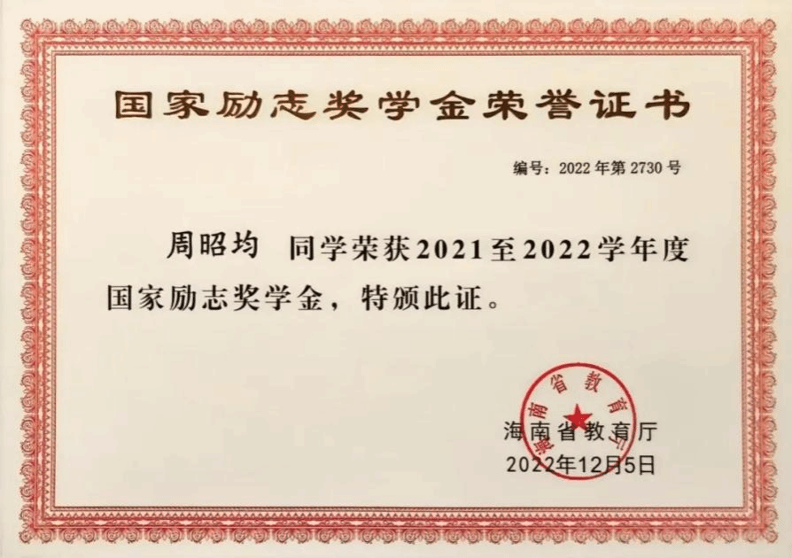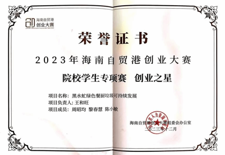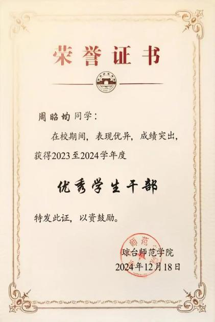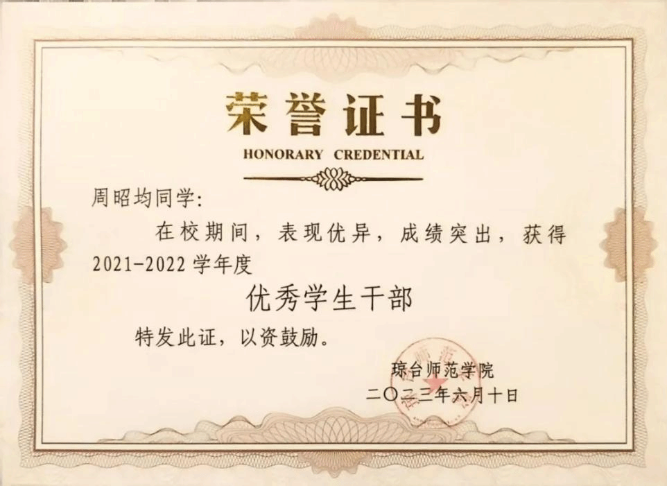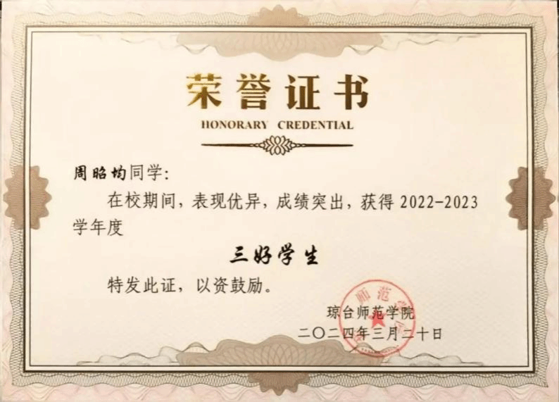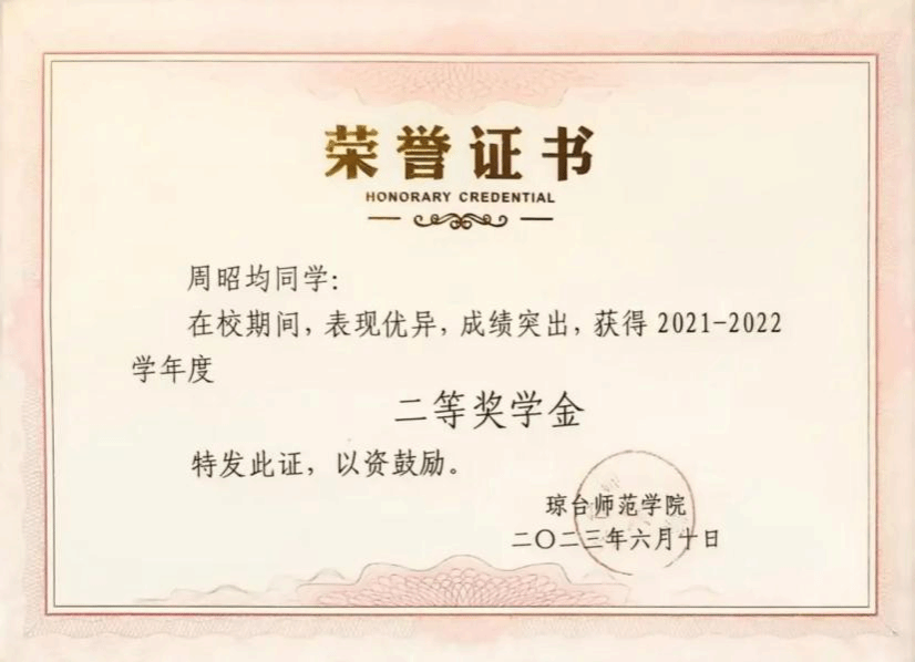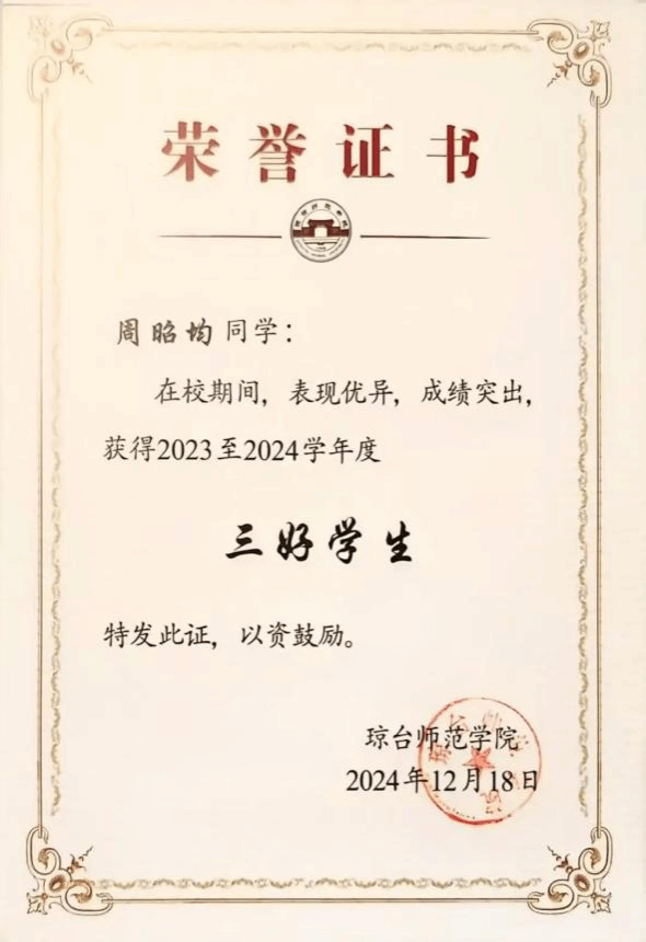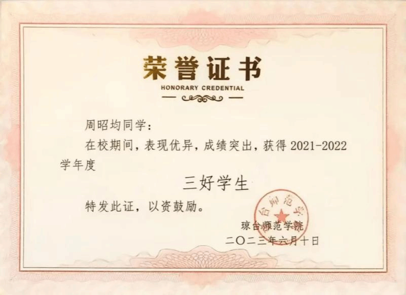 大学四年连续获得“优秀学生干部”和“三好学生”称号;大学四年连续获得“国家励志奖学金”;大学四年连续获得“二等奖学金”;大学四年连续获得“海南省优秀贫困大学生奖学金”;2022年中美创客大赛海口赛区团体赛获省级“一等奖”;2022年中美创客大赛国际赛区团体赛获国家“三等奖”;2023年海南自贸港创业大赛决赛获得“创业之星”。