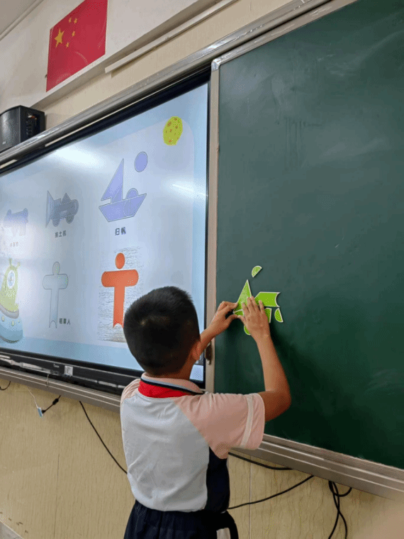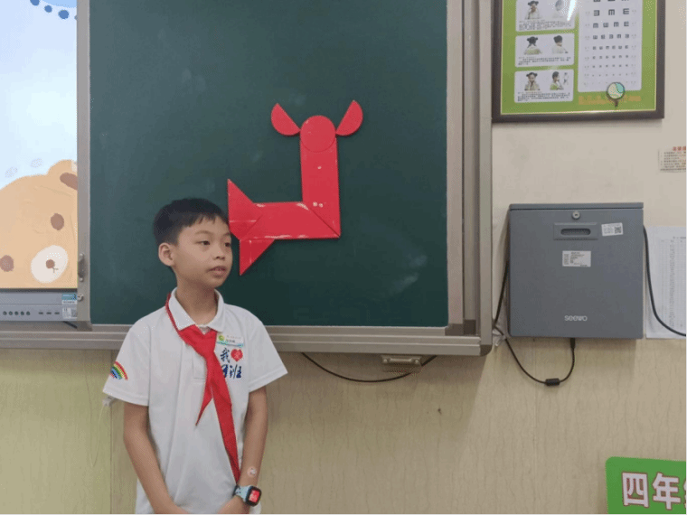 四年级的课堂中,同学们十分活跃,上课积极性较高。在陈怡岐老师的指导下,同学们根据对七巧板的理解,打破固有的思维,充满了智慧的火花,分工协作,发挥团队精神,积极思考,发挥实际动手能力创造出各式各样的作品。同学们充分发挥自己的想象,凭借自己的智慧拼出各种各样有趣的图案,玩出了新意与创意,从七巧板中感受到了数学的乐趣。