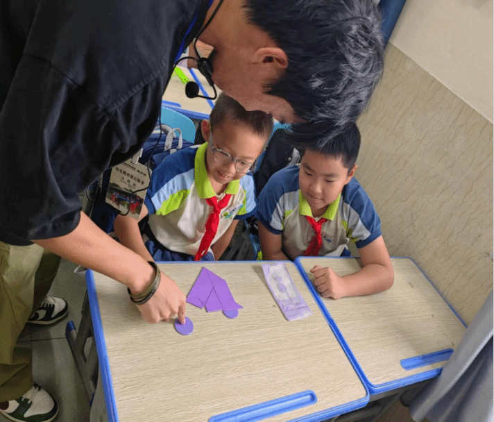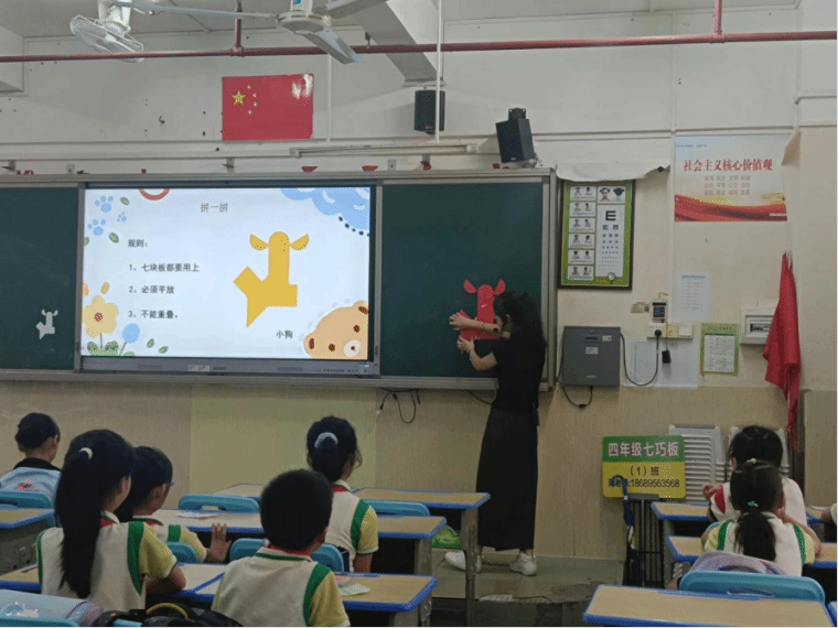 四年级的课堂中,文柏仁老师设定特殊情景,带领同学们走进七巧板的世界,让同学们对智力七巧板有了初步的认识,了解拼图原则,为以后的拼图奠定基础,带领同学们分析七巧板的拼装意义。