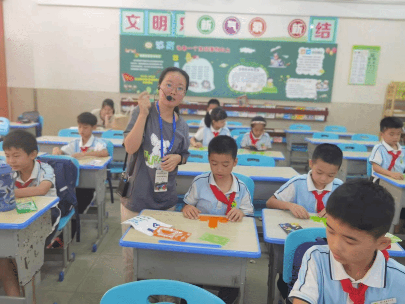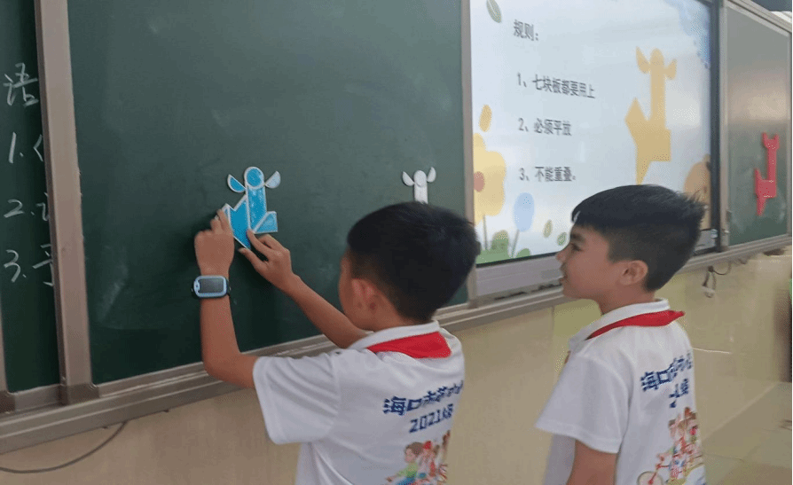与此同时,在实习过程中,理学院组织七巧板教学团队到海口市英才小学,开展新一学期的七巧板教学活动。英才小学有三支小分队在三年级和四年级,开展“玩转七巧板”教学活动。大家分工明确、团结一致地完成教学活动。