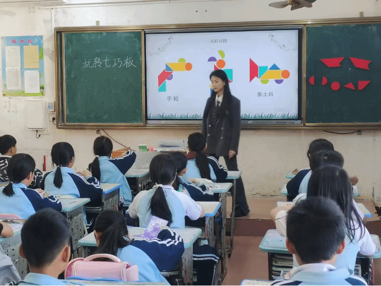 在琼台理院美安中心小学的实践活动中,何丽金老师在五(2)班为学生们开启了一场出神入化的七巧板拼图之旅。