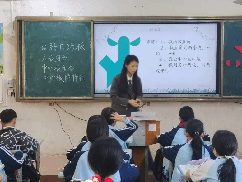何老师将七巧板分为两大类,大板组合与中心组合。让学生们找到拼图的重要板块——中心板。