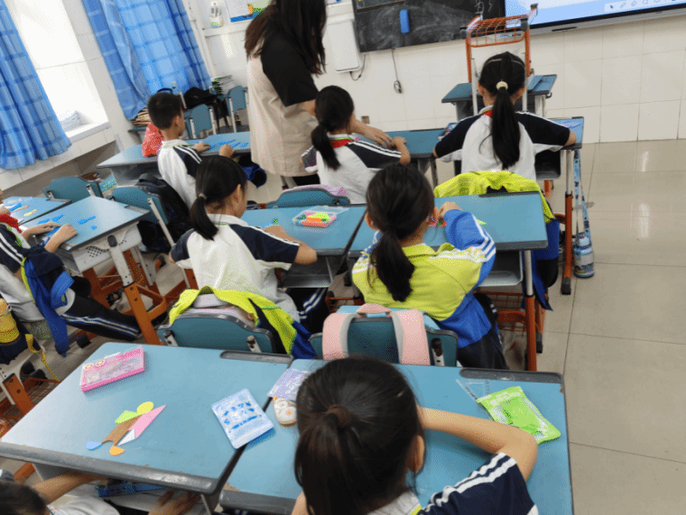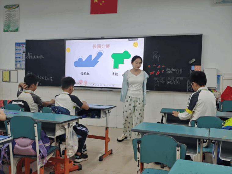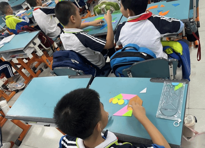 张老师采用了启发式教学,引导学生观察特殊板块的位置并激发学生的想象力。然后通过逐步引导,将复杂的图形画面拆解成几个主要部分,再和七巧板的形状联系起来,帮助学生建立起清晰的拼图思路。同时,运用小组合作学习法,鼓励学生在小组内讨论、尝试不同的拼法,促进学生之间的思想碰撞和相互学习