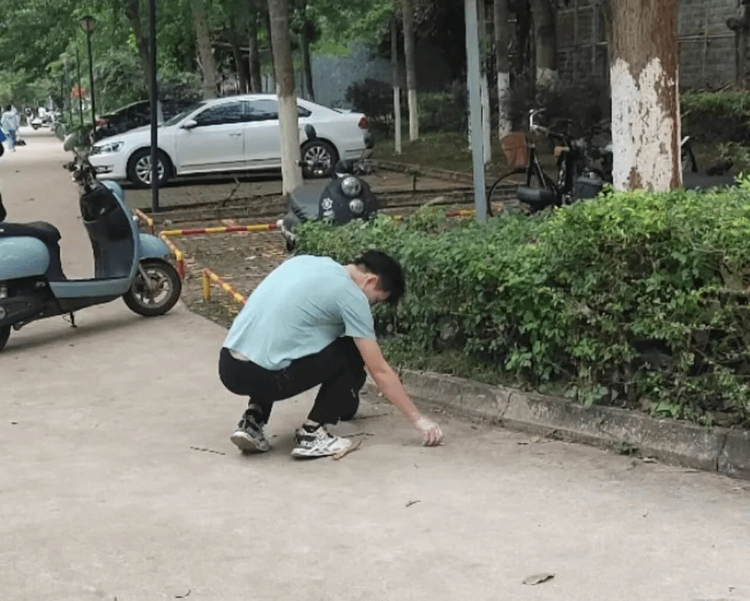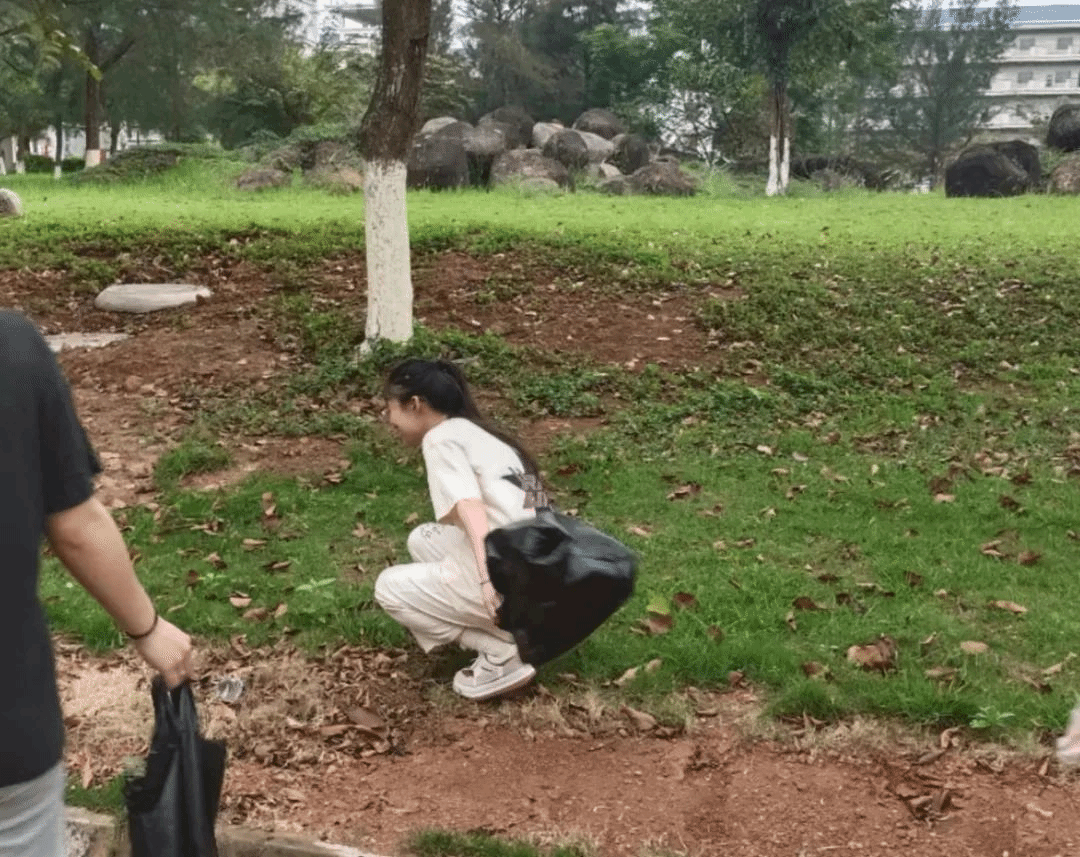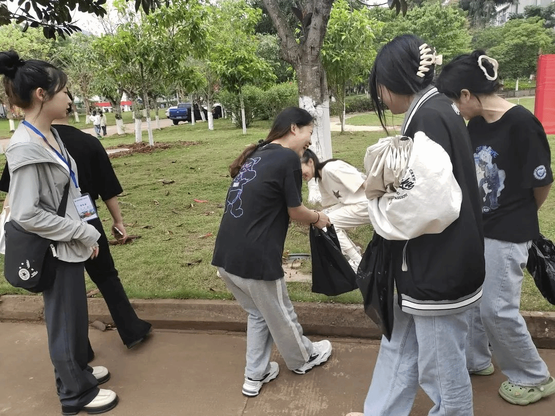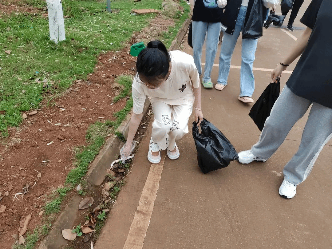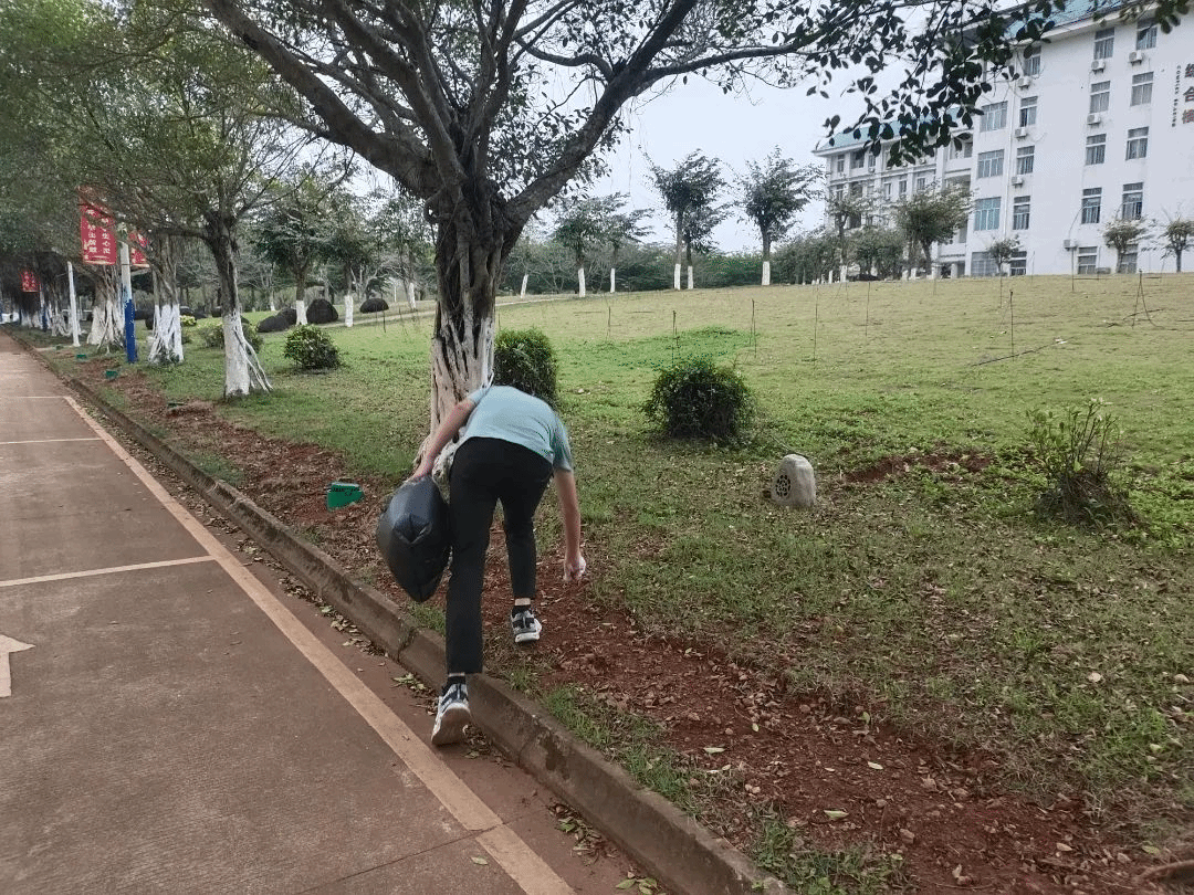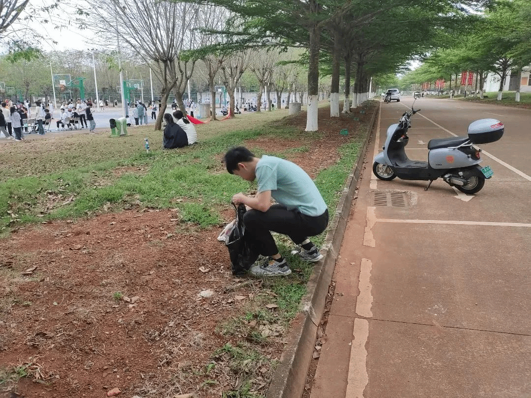 同学们各司其职、分工明确,在负责人的指挥下井然有序地展开了校园道路清洁工作。他们有的帮忙拿垃圾袋,有的负责收集道路上的烟头、废纸等垃圾,有的戴着手套清除草地上的异物。