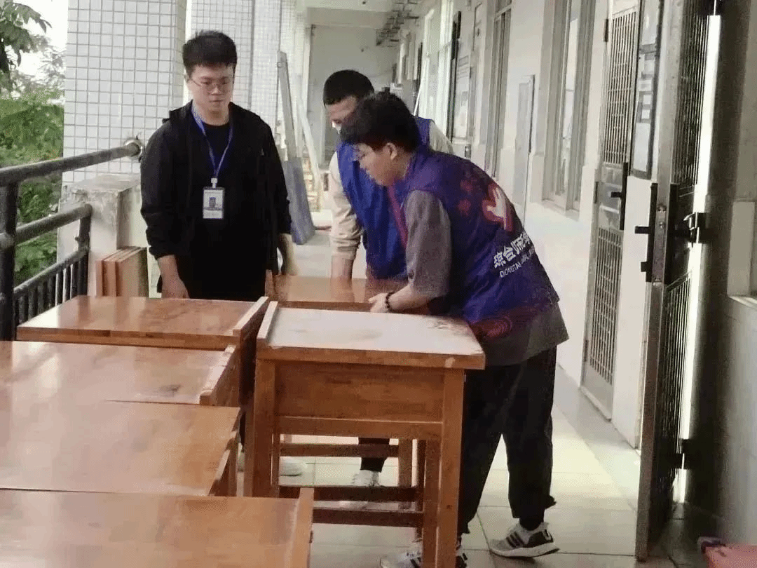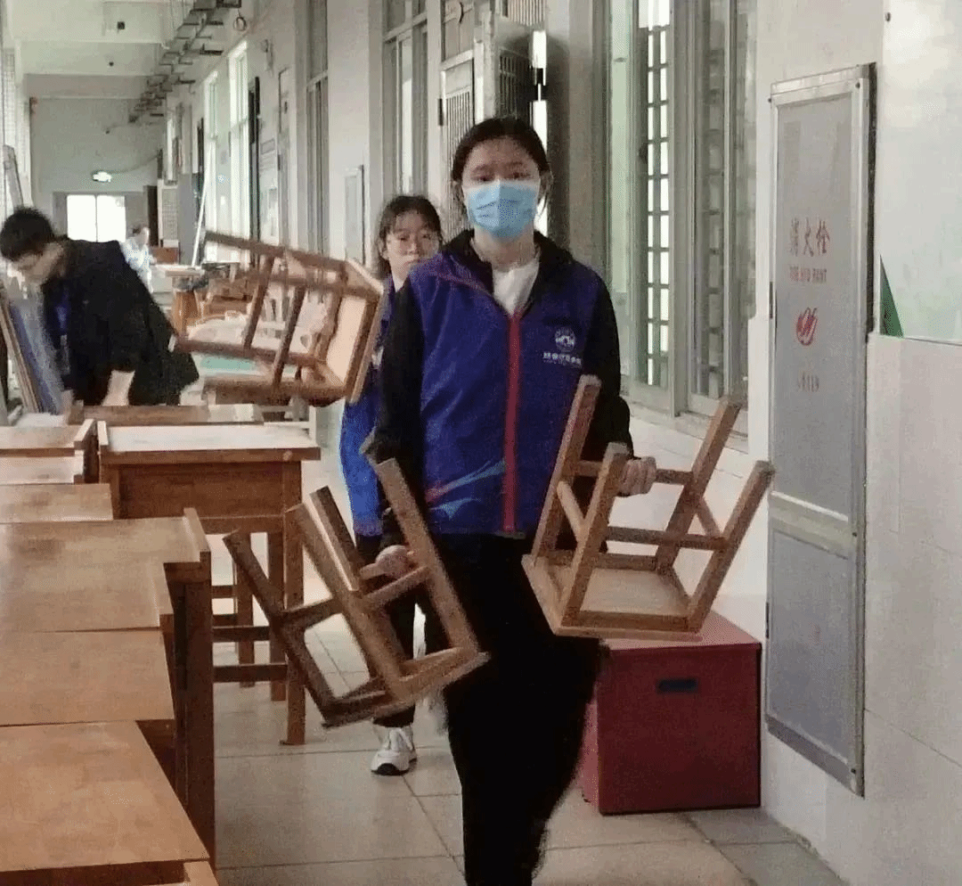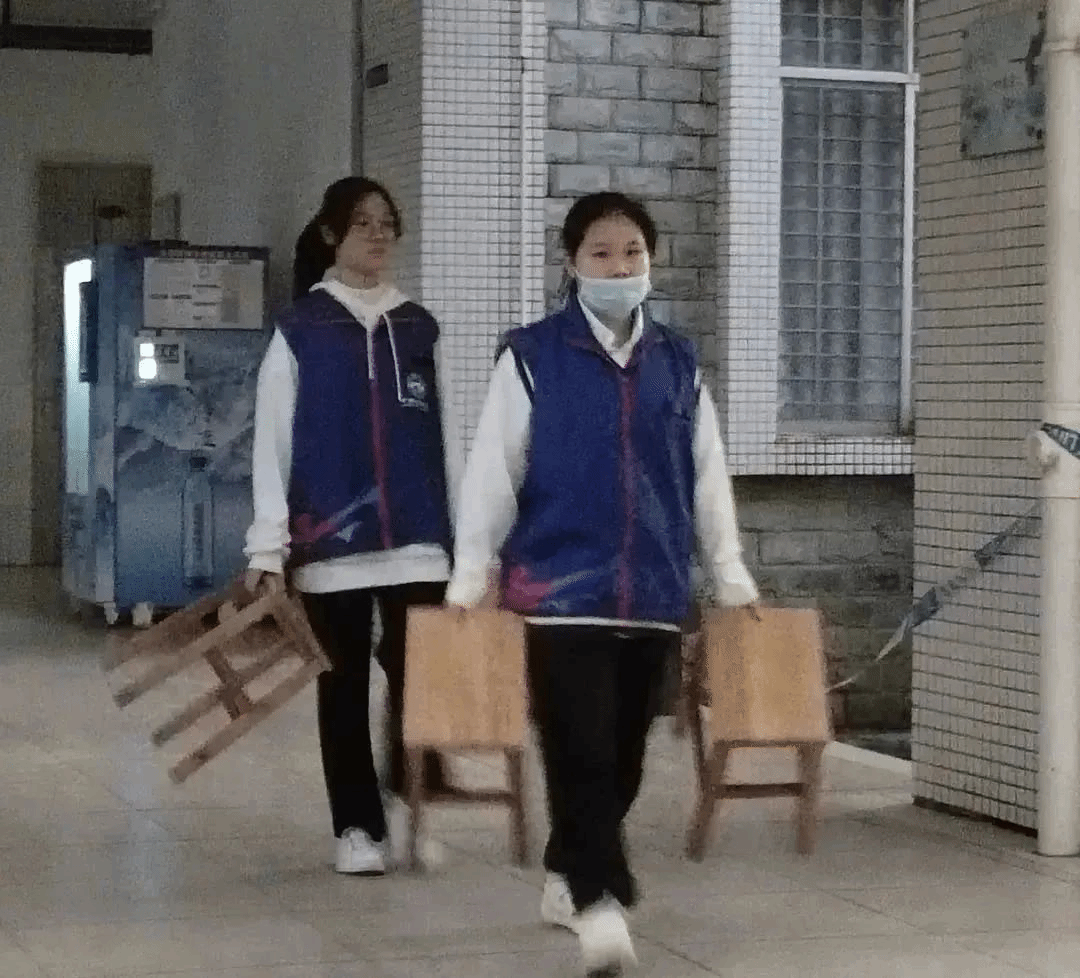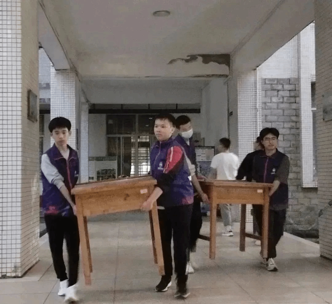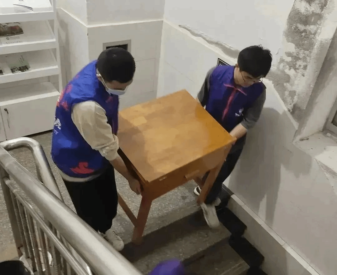 我们的志愿者热情高涨,在搬桌椅工作中,他们身着志愿服,有条不紊地进行着搬运工作,志愿者们秉持乐于助人的志愿精神坚持为同学们服务。尽全力做到最好,展现出负责、积极向上的志愿者形象。
