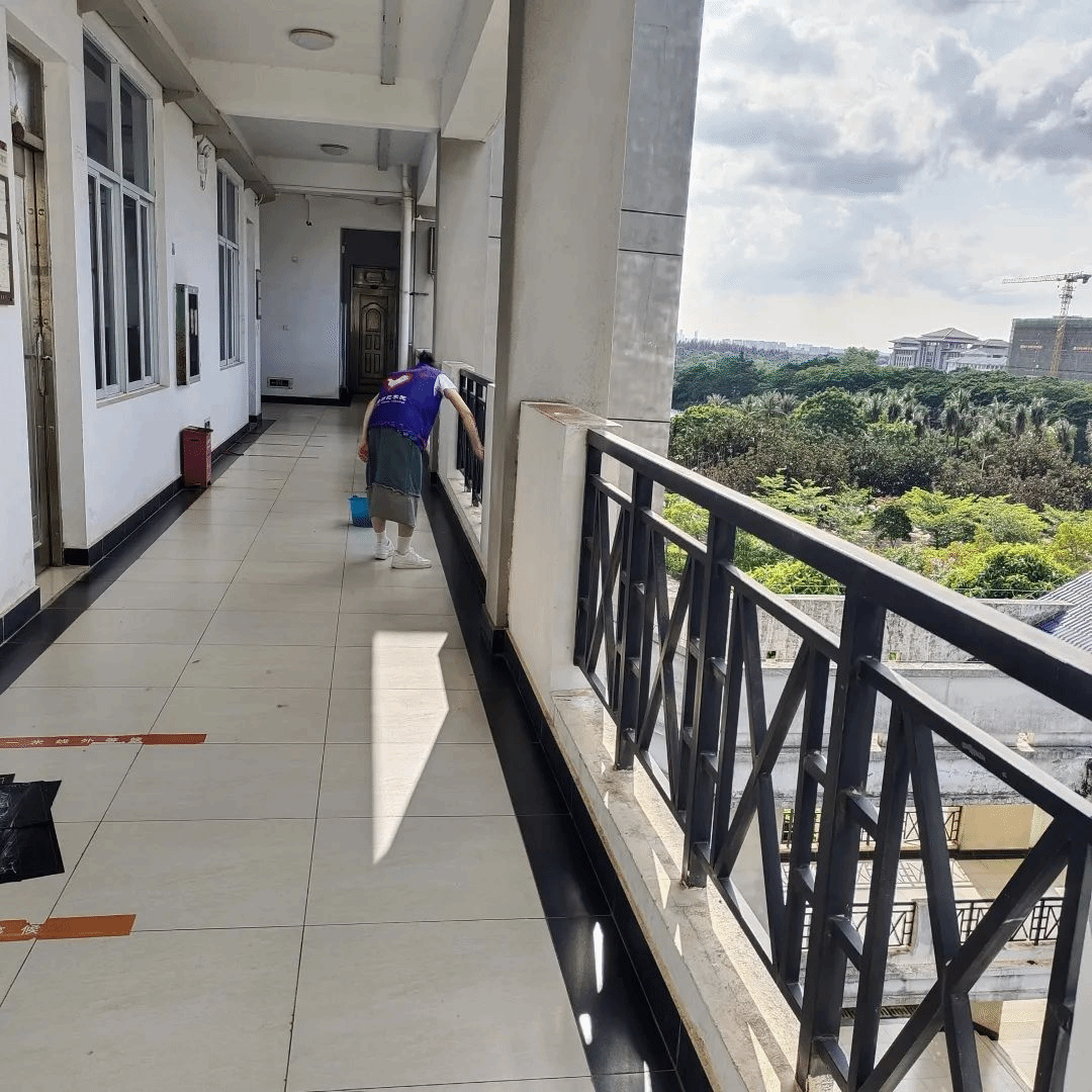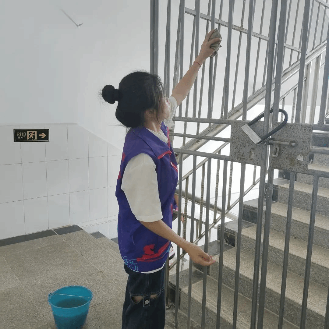 志愿者们在实验楼的ABCD四层四栋对共十六层的栏杆进行清洗擦拭,以此将栏杆和玻璃上堆积的污垢清除。他们各司其职、分工明确,在负责人的带领下井井有条地开展美化楼栋志愿行活动。