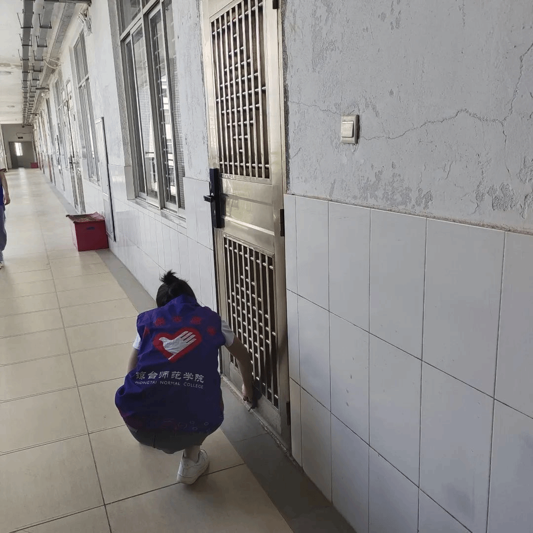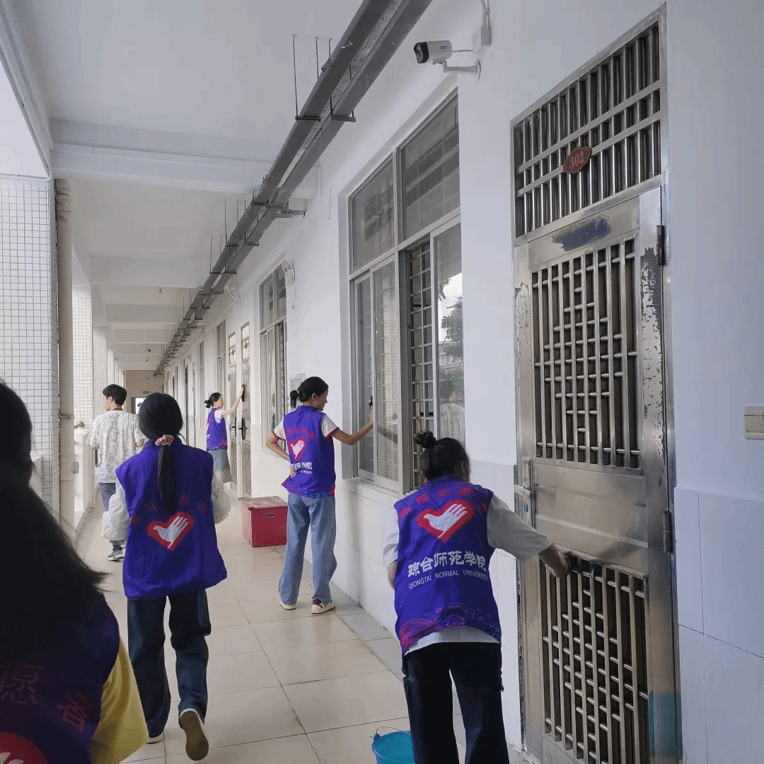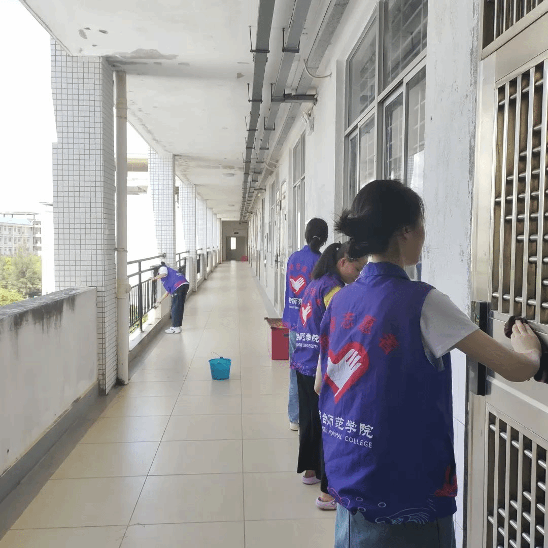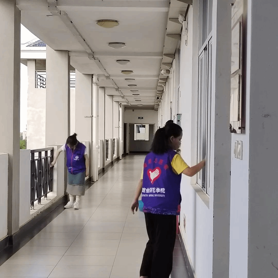 他们有的用水桶去接水,有的拿着抹布擦拭教室的门,有的一丝不苟地拿着抹布擦教室外的栏杆。每一位志愿者们都不辞辛苦,为给同学们提供干净的教室而努力打扫着。