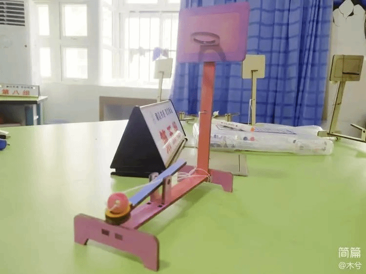 投篮机是利用杠杆原理,放球这边的杠杆长度比另一边长,按压另一边杆端时,可以将球弹出去很远。